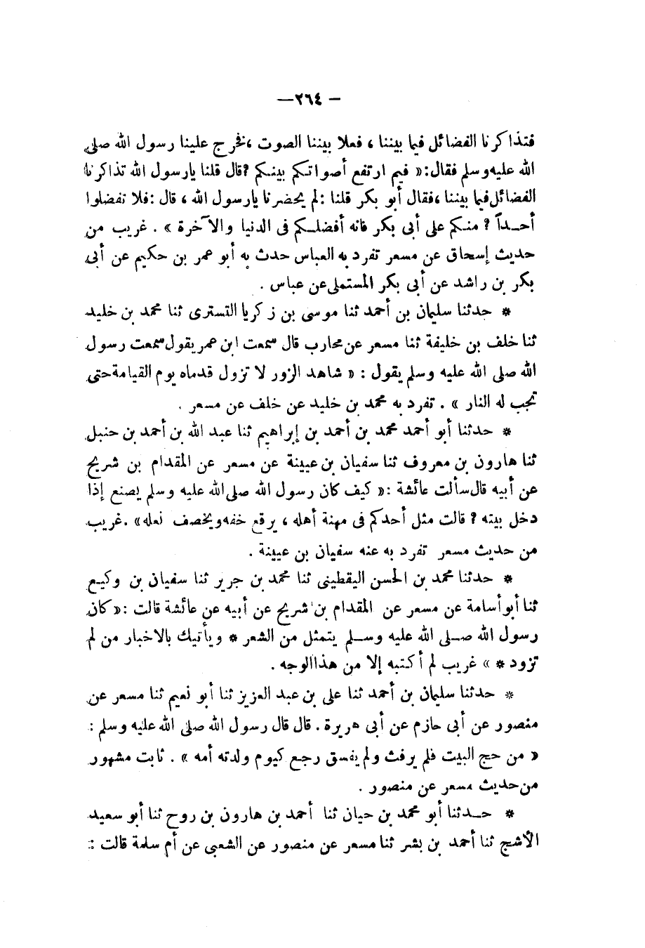 حَدَّثَنَا أَبُو أَحْمَدَ مُحَمَّدُ بْنُ أَحْمَدَ بْنِ إِبْرَاهِيمَ , ثنا عَبْدُ اللهِ بْنُ أَحْمَدَ بْنِ حَنْبَلٍ، ثنا هَارُونُ بْنُ مَعْرُوفٍ، ثنا سُفْيَانُ بْنُ عُيَيْنَةَ، عَنْ مِسْعَرٍ، عَنِ الْمِقْدَامِ بْنِ شُرَيْحٍ، عَنْ أَبِيهِ، قَالَ: " سَأَلْتُ عَائِشَةَ: كَيْفَ كَانَ رَسُولُ اللهِ صَلَّى اللهُ عَلَيْهِ وَسَلَّمَ يَصْنَعُ إِذَا دَخَلَ بَيْتَهُ؟ قَالَتْ: §مِثْلَ أَحَدِكُمْ , فِي مِهْنَةِ أَهْلِهِ , يُرَقِّعُ خُفَّهُ , وَيَخْصِفُ نَعْلَهُ " غَرِيبٌ مِنْ حَدِيثِ مِسْعَرٍ , تَفَرَّدَ بِهِ عَنْهُ سُفْيَانُ بْنُ عُيَيْنَةَ