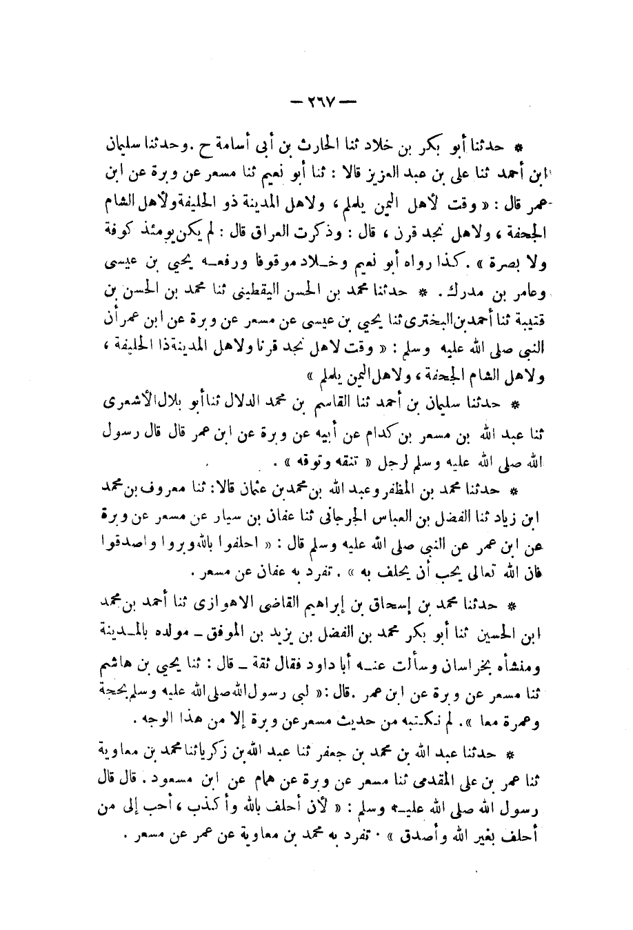 حَدَّثَنَا عَبْدُ اللهِ بْنُ مُحَمَّدِ بْنِ جَعْفَرٍ، ثنا عَبْدُ اللهِ بْنُ زَكَرِيَّا، ثنا مُحَمَّدُ بْنُ مُعَاوِيَةَ، ثنا عُمَرُ بْنُ عَلِيٍّ الْمُقَدَّمِيُّ، ثنا مِسْعَرٌ، عَنْ وَبَرَةَ، عَنْ هَمَّامٍ، عَنِ ابْنِ مَسْعُودٍ، قَالَ: قَالَ رَسُولُ اللهِ صَلَّى اللهُ عَلَيْهِ وَسَلَّمَ: «§لَأَنْ أَحْلِفَ بِاللهِ وَأَكْذِبَ أَحَبُّ إِلَيَّ مِنْ أَحْلِفَ بِغَيْرِ اللهِ وَأَصْدُقَ» تَفَرَّدَ بِهِ مُحَمَّدُ بْنُ مُعَاوِيَةَ , عَنْ عُمَرَ , عَنْ مِسْعَرٍ