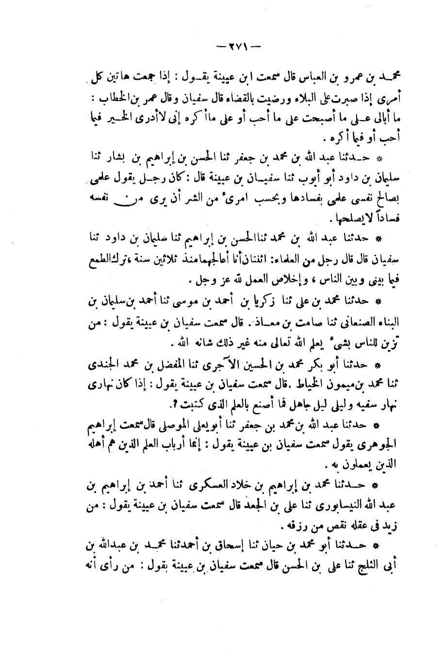حَدَّثَنَا أَبُو بَكْرٍ مُحَمَّدُ بْنُ الْحُسَيْنِ الْآجُرِّيُّ , ثنا الْمُفَضَّلُ بْنُ مُحَمَّدٍ الْجَنَدِيُّ، ثنا مُحَمَّدُ بْنُ مَيْمُونٍ الْخَيَّاطُ، قَالَ: سَمِعْتُ سُفْيَانَ بْنَ عُيَيْنَةَ، يَقُولُ: «§إِذَا كَانَ نَهَارِي نَهَارَ سَفِيهٍ , وَلَيْلِي لَيْلَ جَاهِلٍ فَمَا أَصْنَعُ بِالْعِلْمِ الَّذِي كَتَبْتُ؟»