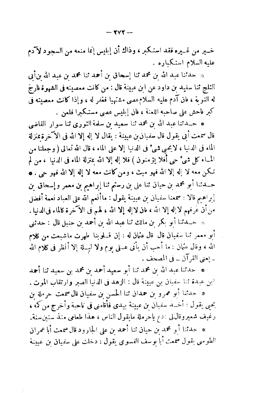 حَدَّثَنَا عَبْدُ اللهِ بْنُ مُحَمَّدٍ، ثنا أَبُو سَعِيدٍ أَحْمَدُ بْنُ مُحَمَّدِ بْنِ سَعِيدٍ , ثنا أَحْمَدُ بْنُ عَبْدَةَ، ثنا سُفْيَانُ بْنُ عُيَيْنَةَ، قَالَ: «§الزُّهْدُ فِي الدُّنْيَا الصَّبْرُ , وَارْتِقَابُ الْمَوْتِ»