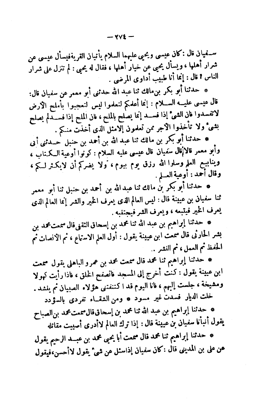 حَدَّثَنَا أَبُو بَكْرِ بْنُ مَالِكٍ، ثنا عَبْدُ اللهِ بْنُ أَحْمَدَ بْنِ حَنْبَلٍ، حَدَّثَنِي أَبِي، وَأَبُو مَعْمَرٍ، قَالَا، قَالَ سُفْيَانُ: قَالَ عِيسَى عَلَيْهِ السَّلَامُ: «§كُونُوا أَوْعِيَةَ الْكِتَابِ , وَيَنَابِيعَ الْعِلْمِ , وَسَلُوا اللهَ رِزْقَ يَوْمٍ بِيَوْمٍ , وَلَا يَضُرُّكُمْ أَنْ لَا يُكْثِرَ لَكُمْ» وَقَالَ أَحْمَدُ: أَوْعِيَةُ الْعِلْمِ