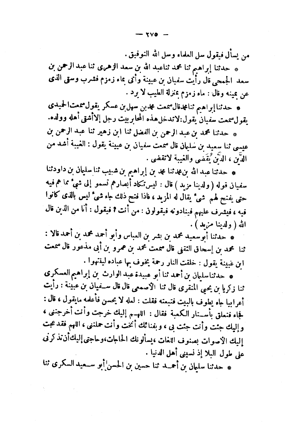 حَدَّثَنَا إِبْرَاهِيمُ، ثنا مُحَمَّدٌ، ثنا عَبْدُ اللهِ بْنُ سَعْدٍ الزُّهْرِيُّ، ثنا عَبْدُ الرَّحْمَنِ بْنُ سَعْدٍ الْجُمَحِيُّ، قَالَ: " رَأَيْتُ سُفْيَانَ بْنَ عُيَيْنَةَ، وَأُتِيَ بِمَاءِ زَمْزَمَ فَشَرِبَ وَسَقَى الَّذِي عَنْ يَمِينِهِ وَقَالَ: §مَاءُ زَمْزَمَ بِمَنْزِلَةِ الطِّيبِ لَا يُرَدُّ "
