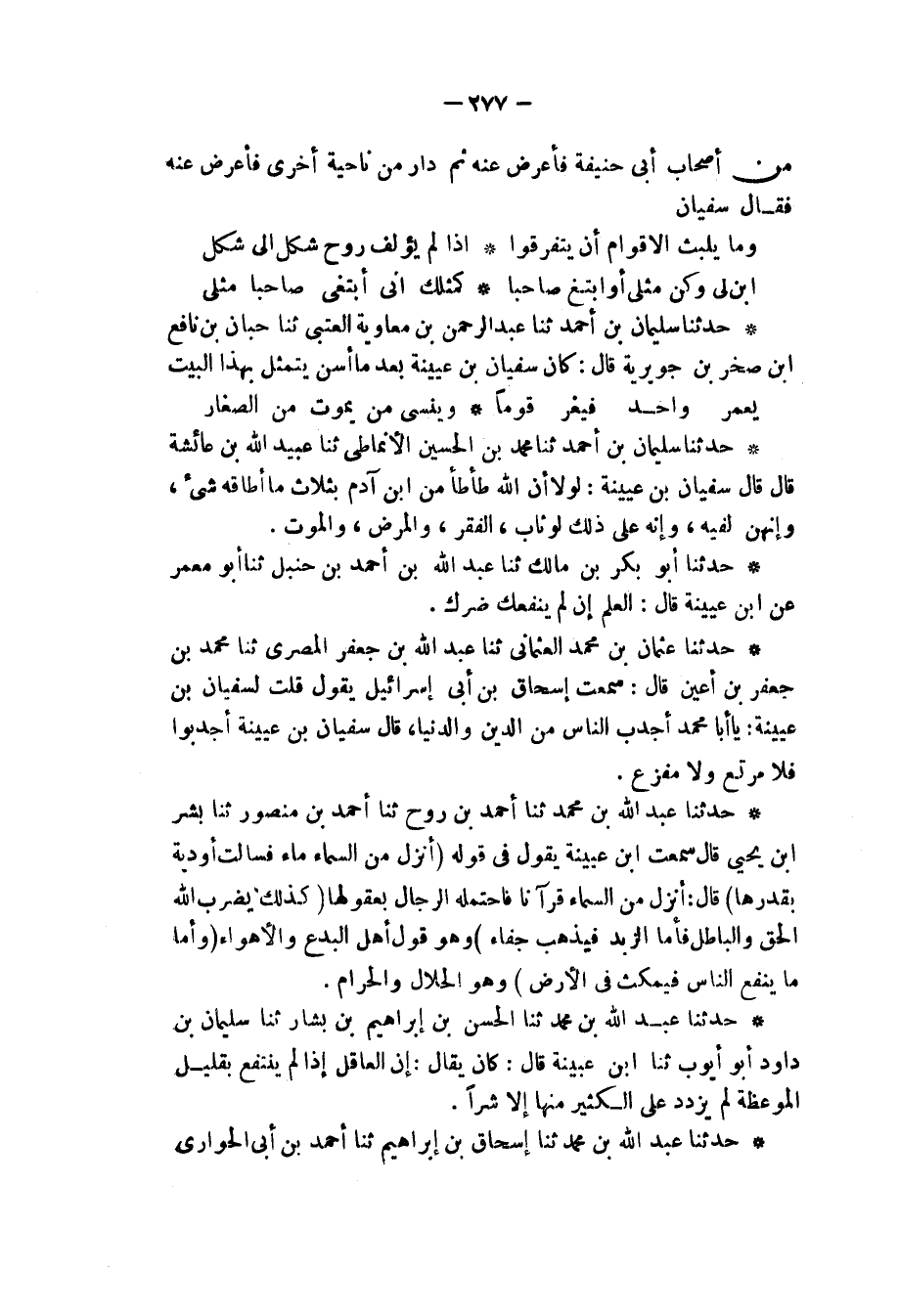 حَدَّثَنَا أَبُو بَكْرِ بْنُ مَالِكٍ، ثنا عَبْدُ اللهِ بْنُ أَحْمَدَ بْنِ حَنْبَلٍ، ثنا أَبُو مَعْمَرٍ، عَنِ ابْنِ عُيَيْنَةَ، قَالَ: «§الْعِلْمُ إِنْ لَمْ يَنْفَعْكَ ضَرَّكَ»
