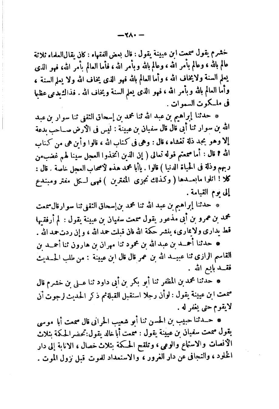 حَدَّثَنَا إِبْرَاهِيمُ بْنُ عَبْدِ اللهِ، ثنا مُحَمَّدُ بْنُ إِسْحَاقَ الثَّقَفِيُّ، ثنا سَوَّارٌ، قَالَ: سَمِعْتُ مُحَمَّدَ بْنَ عَمْرِو بْنِ أَبِي مَذْعُورٍ، يَقُولُ: سَمِعْتُ سُفْيَانَ بْنَ عُيَيْنَةَ، يَقُولُ: «§لَمْ أَرَ فَقِيهًا قَطُّ يُدَارِي، وَلَا يُمَارِي , يَنْشُرُ حِكْمَةَ اللهِ , فَإِنْ قُبِلَتْ حَمِدَ اللهَ , وَإِنْ رُدَّتْ حَمِدَ اللهَ»