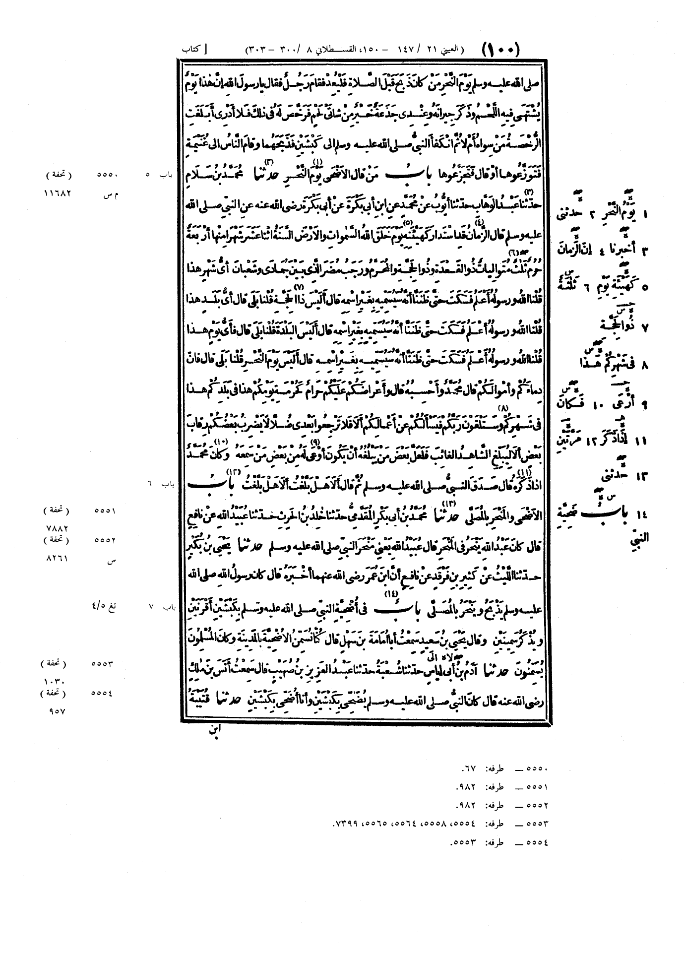 ٥٥٥٠ - حَدَّثَنَا مُحَمَّدُ بْنُ سَلَامٍ، حَدَّثَنَا عَبْدُ الوَهَّابِ، حَدَّثَنَا أَيُّوبُ، عَنْ مُحَمَّدٍ، عَنِ ابْنِ أَبِي بَكْرَةَ، عَنْ أَبِي بَكْرَةَ رَضِيَ اللَّهُ عَنْهُ، عَنِ النَّبِيِّ صَلَّى اللهُ عَلَيْهِ وَسَلَّمَ قَالَ: " إِنَّ الزَّمَانَ قَدِ اسْتَدَارَ كَهَيْئَتِهِ يَوْمَ خَلَقَ اللَّهُ السَّمَوَاتِ وَالأَرْضَ، السَّنَةُ اثْنَا عَشَرَ شَهْرًا، مِنْهَا أَرْبَعَةٌ حُرُمٌ، ثَلَاثٌ مُتَوَالِيَاتٌ: ذُو القَعْدَةِ، وَذُو الحِجَّةِ، وَالمُحَرَّمُ، وَرَجَبُ مُضَرَ الَّذِي بَيْنَ جُمَادَى وَشَعْبَانَ، أَيُّ شَهْرٍ هَذَا؟ " قُلْنَا: اللَّهُ وَرَسُولُهُ أَعْلَمُ، فَسَكَتَ حَتَّى ظَنَنَّا أَنَّهُ سَيُسَمِّيهِ بِغَيْرِ اسْمِهِ، قَالَ: «أَلَيْسَ ذَا الحِجَّةِ؟» قُلْنَا: بَلَى، قَالَ: «أَيُّ بَلَدٍ هَذَا؟» قُلْنَا: اللَّهُ وَرَسُولُهُ أَعْلَمُ، فَسَكَتَ حَتَّى ظَنَنَّا أَنَّهُ سَيُسَمِّيهِ بِغَيْرِ اسْمِهِ، قَالَ: «أَلَيْسَ البَلْدَةَ؟» قُلْنَا: بَلَى، قَالَ: «فَأَيُّ يَوْمٍ هَذَا؟» قُلْنَا: اللَّهُ وَرَسُولُهُ أَعْلَمُ، فَسَكَتَ حَتَّى ظَنَنَّا أَنَّهُ سَيُسَمِّيهِ بِغَيْرِ اسْمِهِ، قَالَ: «أَلَيْسَ يَوْمَ النَّحْرِ؟» قُلْنَا: بَلَى، قَالَ: " فَإِنَّ دِمَاءَكُمْ وَأَمْوَالَكُمْ - قَالَ مُحَمَّدٌ: وَأَحْسِبُهُ قَالَ - وَأَعْرَاضَكُمْ عَلَيْكُمْ حَرَامٌ، كَحُرْمَةِ يَوْمِكُمْ هَذَا، فِي بَلَدِكُمْ هَذَا، فِي شَهْرِكُمْ هَذَا، وَسَتَلْقَوْنَ رَبَّكُمْ، فَيَسْأَلُكُمْ عَنْ أَعْمَالِكُمْ، أَلَا فَلَا تَرْجِعُوا بَعْدِي ضُلَّالًا، يَضْرِبُ بَعْضُكُمْ رِقَابَ بَعْضٍ، أَلَا لِيُبَلِّغِ الشَّاهِدُ الغَائِبَ، فَلَعَلَّ بَعْضَ مَنْ يَبْلُغُهُ أَنْ يَكُونَ أَوْعَى لَهُ مِنْ بَعْضِ مَنْ سَمِعَهُ - وَكَانَ مُحَمَّدٌ إِذَا ذَكَرَهُ قَالَ: صَدَقَ النَّبِيُّ صَلَّى اللهُ عَلَيْهِ وَسَلَّمَ، ثُمَّ قَالَ - أَلَا هَلْ بَلَّغْتُ، أَلَا هَلْ بَلَّغْتُ مَرَّتَيْنِ "