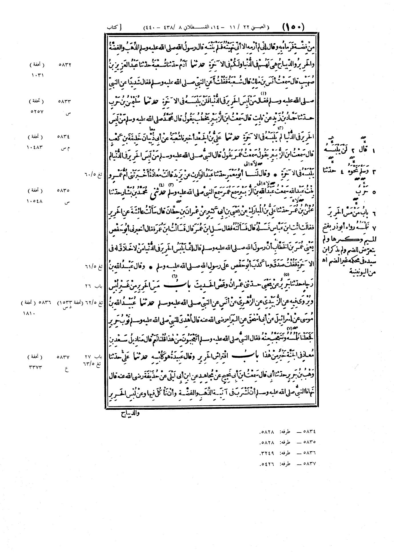 ٥٨٣٥ - حَدَّثَنِي مُحَمَّدُ بْنُ بَشَّارٍ، حَدَّثَنَا عُثْمَانُ بْنُ عُمَرَ، حَدَّثَنَا عَلِيُّ بْنُ المُبَارَكِ، عَنْ يَحْيَى بْنِ أَبِي كَثِيرٍ، عَنْ عِمْرَانَ بْنِ حِطَّانَ، قَالَ: سَأَلْتُ عَائِشَةَ عَنِ الحَرِيرِ فَقَالَتْ: ائْتِ ابْنَ عَبَّاسٍ فَسَلْهُ، قَالَ: فَسَأَلْتُهُ فَقَالَ: سَلْ ابْنَ عُمَرَ، قَالَ: فَسَأَلْتُ ابْنَ عُمَرَ، فَقَالَ: أَخْبَرَنِي أَبُو حَفْصٍ يَعْنِي عُمَرَ بْنَ الخَطَّابِ: أَنَّ رَسُولَ اللَّهِ صَلَّى اللهُ عَلَيْهِ وَسَلَّمَ قَالَ: «إِنَّمَا يَلْبَسُ الحَرِيرَ فِي الدُّنْيَا مَنْ لَا خَلَاقَ لَهُ فِي الآخِرَةِ» فَقُلْتُ: صَدَقَ، وَمَا كَذَبَ أَبُو حَفْصٍ عَلَى رَسُولِ اللَّهِ صَلَّى اللهُ عَلَيْهِ وَسَلَّمَ وَقَالَ عَبْدُ اللَّهِ بْنُ رَجَاءٍ: حَدَّثَنَا حَرْبٌ، عَنْ يَحْيَى، حَدَّثَنِي عِمْرَانُ، وَقَصَّ الحَدِيثَ