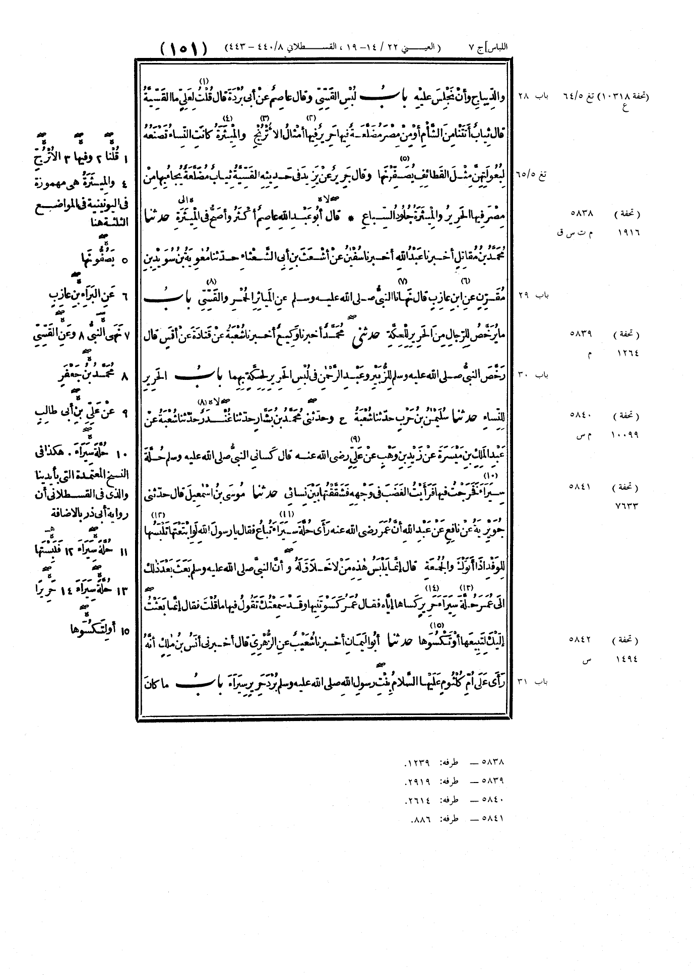 [ ش (مضلعة) فيها خطوط عريضة كلأضلاع من الحرير. (الأترج) هو شجر يعلو ناعم الأغصان والورق والثمر وثمره كالليمون الكبار وهو ذهبي اللون ذكي الرائحة حامض الماء. قال في الفتح أي إن الأضلاع التي فيها غليظة معوجة. (الميثرة) ثوب يجلل بها الثياب فتعلوها وقيل هي أغشية السروج تتخذ من الحرير. (القطائف) جمع قطيفة وهي الكساء المخمل. (يصفونها) يجعلونها كالصفة على السرج قال الحافظ في الفتح وحكى عياض في رواية (يصفرنها) بكسر الفاء ثم راء وأظنه تصحيفا