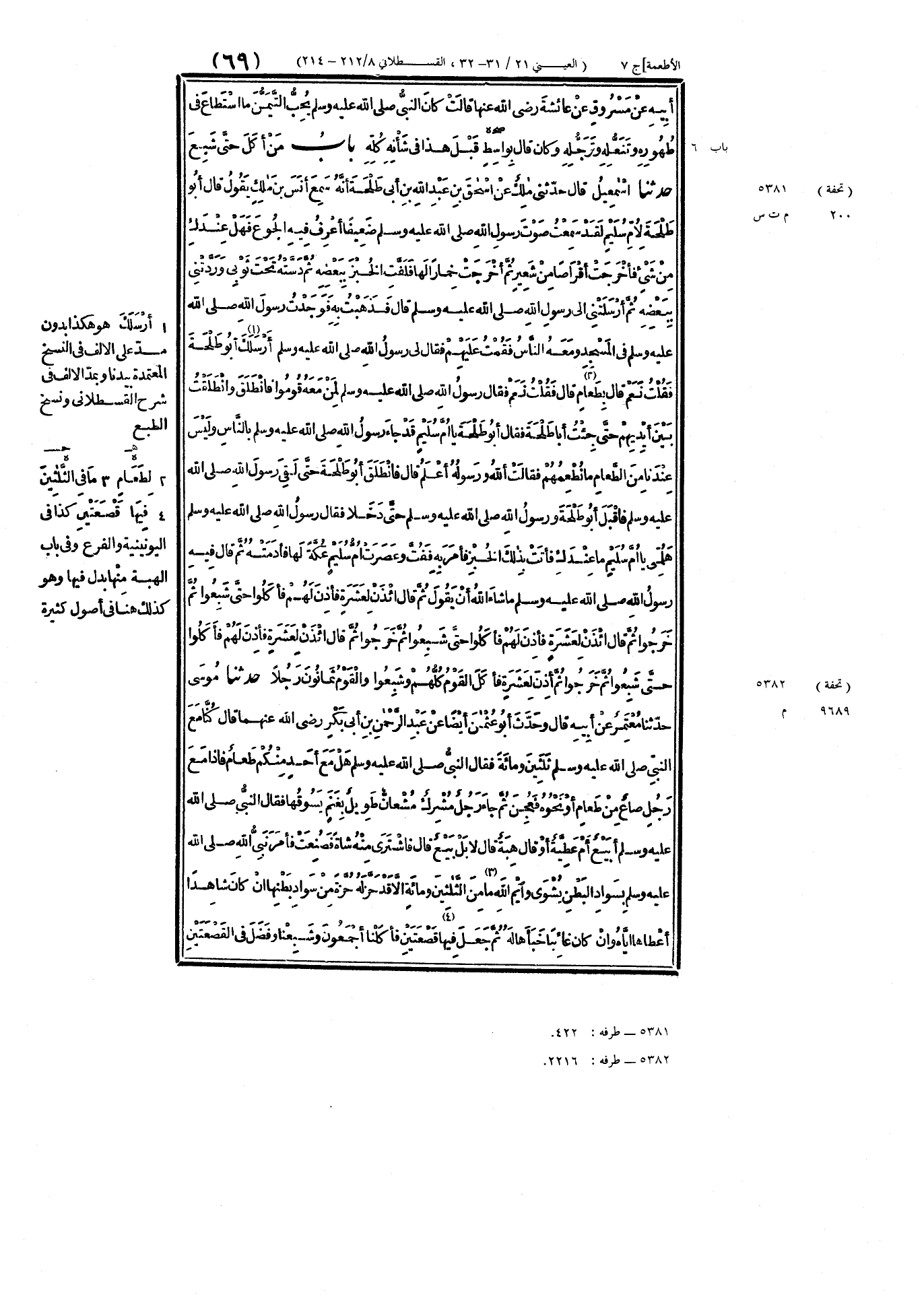 ٥٣٨١ - حَدَّثَنَا إِسْمَاعِيلُ، قَالَ: حَدَّثَنِي مَالِكٌ، عَنْ إِسْحَاقَ بْنِ عَبْدِ اللَّهِ بْنِ أَبِي طَلْحَةَ، أَنَّهُ سَمِعَ أَنَسَ بْنَ مَالِكٍ، يَقُولُ: قَالَ أَبُو طَلْحَةَ لِأُمِّ سُلَيْمٍ: لَقَدْ سَمِعْتُ صَوْتَ رَسُولِ اللَّهِ صَلَّى اللهُ عَلَيْهِ وَسَلَّمَ ضَعِيفًا، أَعْرِفُ فِيهِ الجُوعَ، فَهَلْ عِنْدَكِ مِنْ شَيْءٍ؟ فَأَخْرَجَتْ أَقْرَاصًا مِنْ شَعِيرٍ، ثُمَّ أَخْرَجَتْ خِمَارًا لَهَا، فَلَفَّتِ الخُبْزَ بِبَعْضِهِ، ثُمَّ دَسَّتْهُ تَحْتَ ثَوْبِي، وَرَدَّتْنِي بِبَعْضِهِ، ثُمَّ أَرْسَلَتْنِي إِلَى رَسُولِ اللَّهِ صَلَّى اللهُ عَلَيْهِ وَسَلَّمَ، قَالَ: فَذَهَبْتُ بِهِ، فَوَجَدْتُ رَسُولَ اللَّهِ صَلَّى اللهُ عَلَيْهِ وَسَلَّمَ فِي المَسْجِدِ وَمَعَهُ النَّاسُ، فَقُمْتُ عَلَيْهِمْ، فَقَالَ لِي رَسُولُ اللَّهِ صَلَّى اللهُ عَلَيْهِ وَسَلَّمَ: «أَرْسَلَكَ أَبُو طَلْحَةَ؟» فَقُلْتُ: نَعَمْ، قَالَ: «بِطَعَامٍ؟» قَالَ: فَقُلْتُ: نَعَمْ، فَقَالَ رَسُولُ اللَّهِ صَلَّى اللهُ عَلَيْهِ وَسَلَّمَ لِمَنْ مَعَهُ: «قُومُوا» فَانْطَلَقَ وَانْطَلَقْتُ بَيْنَ أَيْدِيهِمْ، حَتَّى جِئْتُ أَبَا طَلْحَةَ، فَقَالَ أَبُو طَلْحَةَ: يَا أُمَّ سُلَيْمٍ، قَدْ جَاءَ رَسُولُ اللَّهِ صَلَّى اللهُ عَلَيْهِ وَسَلَّمَ بِالنَّاسِ، وَلَيْسَ عِنْدَنَا مِنَ الطَّعَامِ مَا نُطْعِمُهُمْ، فَقَالَتْ: اللَّهُ وَرَسُولُهُ أَعْلَمُ، قَالَ: فَانْطَلَقَ أَبُو طَلْحَةَ حَتَّى لَقِيَ رَسُولَ اللَّهِ صَلَّى اللهُ عَلَيْهِ وَسَلَّمَ، فَأَقْبَلَ أَبُو طَلْحَةَ وَرَسُولُ اللَّهِ صَلَّى اللهُ عَلَيْهِ وَسَلَّمَ حَتَّى دَخَلَا، فَقَالَ رَسُولُ اللَّهِ صَلَّى اللهُ عَلَيْهِ وَسَلَّمَ: «هَلُمِّي يَا أُمَّ سُلَيْمٍ، مَا عِنْدَكِ» فَأَتَتْ بِذَلِكَ الخُبْزِ، فَأَمَرَ بِهِ فَفُتَّ، وَعَصَرَتْ أُمُّ سُلَيْمٍ عُكَّةً لَهَا فَأَدَمَتْهُ، ثُمَّ قَالَ فِيهِ رَسُولُ اللَّهِ صَلَّى اللهُ عَلَيْهِ وَسَلَّمَ مَا شَاءَ اللَّهُ أَنْ يَقُولَ، ثُمَّ قَالَ: «ائْذَنْ لِعَشَرَةٍ» فَأَذِنَ لَهُمْ، فَأَكَلُوا حَتَّى شَبِعُوا، ثُمَّ خَرَجُوا، ثُمَّ قَالَ: «ائْذَنْ لِعَشَرَةٍ» فَأَذِنَ لَهُمْ فَأَكَلُوا حَتَّى شَبِعُوا، ثُمَّ خَرَجُوا، ثُمَّ قَالَ: «ائْذَنْ لِعَشَرَةٍ» فَأَذِنَ لَهُمْ، فَأَكَلُوا حَتَّى شَبِعُوا ثُمَّ خَرَجُوا، ثُمَّ أَذِنَ لِعَشَرَةٍ فَأَكَلَ القَوْمُ كُلُّهُمْ وَشَبِعُوا، وَالقَوْمُ ثَمَانُونَ رَجُلًا