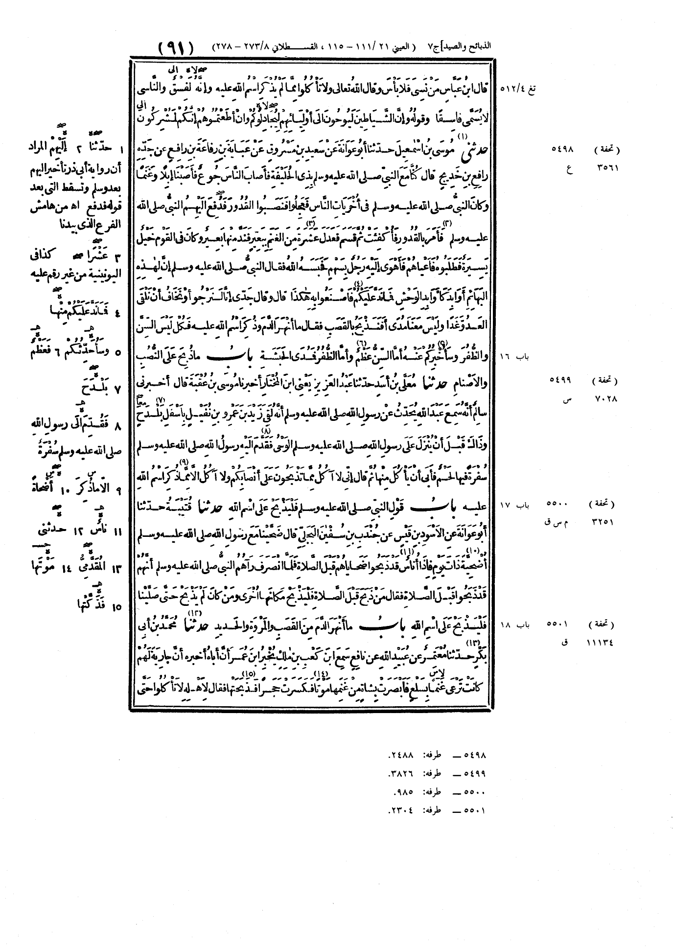 ٥٤٩٨ - حَدَّثَنِي مُوسَى بْنُ إِسْمَاعِيلَ، حَدَّثَنَا أَبُو عَوَانَةَ، عَنْ سَعِيدِ بْنِ مَسْرُوقٍ، عَنْ عَبَايَةَ بْنِ رِفَاعَةَ بْنِ رَافِعٍ، عَنْ جَدِّهِ رَافِعِ بْنِ خَدِيجٍ، قَالَ: كُنَّا مَعَ النَّبِيِّ صَلَّى اللهُ عَلَيْهِ وَسَلَّمَ بِذِي الحُلَيْفَةِ، فَأَصَابَ النَّاسَ جُوعٌ، فَأَصَبْنَا إِبِلًا وَغَنَمًا، وَكَانَ النَّبِيُّ صَلَّى اللهُ عَلَيْهِ وَسَلَّمَ فِي أُخْرَيَاتِ النَّاسِ، فَعَجِلُوا فَنَصَبُوا القُدُورَ، فَدُفِعَ إِلَيْهِمُ النَّبِيُّ صَلَّى اللهُ عَلَيْهِ وَسَلَّمَ فَأَمَرَ بِالقُدُورِ فَأُكْفِئَتْ، ثُمَّ قَسَمَ فَعَدَلَ عَشَرَةً مِنَ الغَنَمِ بِبَعِيرٍ، فَنَدَّ مِنْهَا بَعِيرٌ، وَكَانَ فِي القَوْمِ خَيْلٌ يَسِيرَةٌ، فَطَلَبُوهُ فَأَعْيَاهُمْ، فَأَهْوَى إِلَيْهِ رَجُلٌ بِسَهْمٍ فَحَبَسَهُ اللَّهُ، فَقَالَ النَّبِيُّ صَلَّى اللهُ عَلَيْهِ وَسَلَّمَ: «إِنَّ لِهَذِهِ البَهَائِمِ أَوَابِدَ كَأَوَابِدِ الوَحْشِ، فَمَا نَدَّ عَلَيْكُمْ مِنْهَا فَاصْنَعُوا بِهِ هَكَذَا» قَالَ: وَقَالَ جَدِّي: إِنَّا لَنَرْجُو، أَوْ نَخَافُ، أَنْ نَلْقَى العَدُوَّ غَدًا، وَلَيْسَ مَعَنَا مُدًى، أَفَنَذْبَحُ بِالقَصَبِ؟ فَقَالَ: " مَا أَنْهَرَ الدَّمَ وَذُكِرَ اسْمُ اللَّهِ عَلَيْهِ فَكُلْ، لَيْسَ السِّنَّ وَالظُّفُرَ، وَسَأُخْبِرُكُمْ عَنْهُ: أَمَّا السِّنُّ فَعَظْمٌ، وَأَمَّا الظُّفُرُ فَمُدَى الحَبَشَةِ "