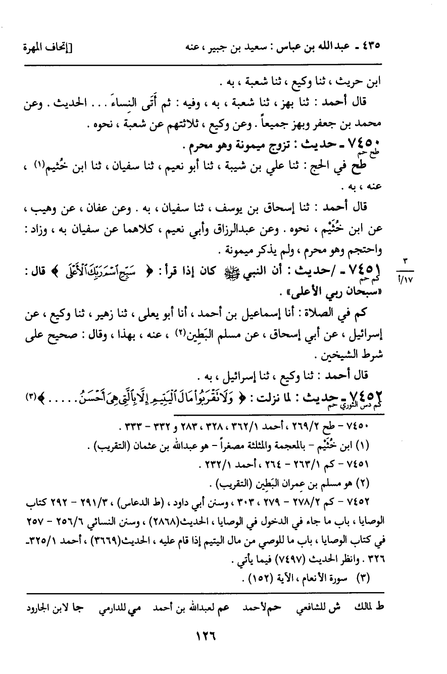 7450 - حَدِيثٌ (طح حم) : تَزَوَّجَ مَيْمُونَةَ وَهُوَ مُحْرِمٌ. طح فِي الْحَجِّ: ثنا عَلِيُّ بْنُ شَيْبَةَ، ثنا أَبُو نُعَيْمٍ، ثنا سُفْيَانُ، ثنا ابْنُ خُثَيْمٍ، عَنْهُ، بِهِ. قَالَ أَحْمَدُ: ثنا إِسْحَاقُ بْنُ يُوسُفَ، ثنا سُفْيَانُ، بِهِ. وَعَنْ عَفَّانَ، عَنْ وُهَيْبٍ، عَنِ ابْنِ خُثَيْمٍ، نَحْوَهُ. وَعَنْ عَبْدِ الرَّزَّاقِ، وَأَبِي نُعَيْمٍ، كِلاهُمَا عَنْ سُفْيَانَ بِهِ، وَزَادَ: وَاحْتَجَمَ وَهُوَ مُحْرِمٌ، وَلَمْ يَذْكُرْ مَيْمُونَةَ.