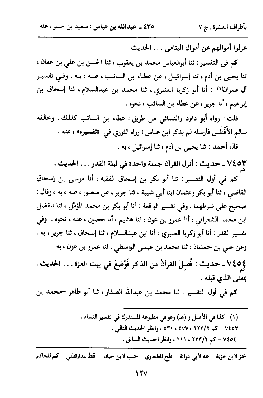 7453 - حَدِيثٌ (كم) : أُنْزِلَ الْقُرْآنُ جُمْلَةً وَاحِدَةً فِي لَيْلَةِ الْقَدْرِ. . . . الْحَدِيثَ. كم فِي أَوَّلِ التَّفْسِيرِ: ثنا أَبُو بَكْرِ بْنُ إِسْحَاقَ الْفَقِيهُ، أنا مُوسَى بْنُ إِسْحَاقَ الْقَاضِي، ثنا أَبُو بَكْرٍ، وَعُثْمَانُ ابْنَا أَبِي شَيْبَةَ، ثنا جَرِيرٌ، عَنْ مَنْصُورٍ، عَنْهُ، بِهِ، وَقَالَ: صَحِيحٌ عَلَى شَرْطِهِمَا. وَفِي تَفْسِيرِ الْوَاقِعَةِ: أنا أَبُو بَكْرِ بْنُ مُحَمَّدٍ الْمُؤَمَّلُ، ثنا الْمُفَضَّلُ بْنُ مُحَمَّدٍ الشَّعْرَانِيُّ، أنا عَمْرُو بْنُ عَوْنٍ، ثنا هُشَيْمٌ، أنا حُصَيْنٌ، عَنْهُ، نَحْوَهُ. وَفِي تَفْسِيرِ الْقَدْرِ: أنا زَكَرِيَّا الْعَنْبَرِيُّ، أنا ابْنُ عَبْدِ السَّلامِ، ثنا إِسْحَاقُ، ثنا جَرِيرٌ، بِهِ. وَعَنْ عَلِيِّ بْنِ حَمْشَاذَ، ثنا مُحَمَّدُ بْنُ عِيسَى الْوَاسِطِيُّ، ثنا عَمْرُو بْنُ عَوْنٍ، بِهِ.