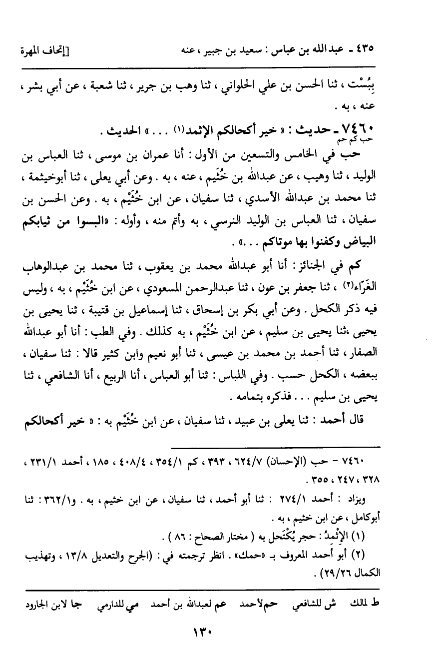 7460 - حَدِيثٌ (حب كم حم) : " خَيْرُ أَكْحَالِكُمُ الإِثْمِدُ. . . . " الْحَدِيثَ. حب فِي الْخَامِسِ وَالتِّسْعِينَ مِنَ الأَوَّلِ: أنا عِمْرَانُ بْنُ مُوسَى، ثنا الْعَبَّاسُ بْنُ الْوَلِيدِ، ثنا وُهَيْبٌ، عَنْ عَبْدِ اللَّهِ بْنِ خُثَيْمٍ، عَنْهُ، بِهِ. وَعَنْ أَبِي يَعْلَى، ثنا أَبُو خَيْثَمَةَ، ثنا مُحَمَّدُ بْنُ عَبْدِ اللَّهِ الأَسَدِيُّ، ثنا سُفْيَانُ، عَنِ ابْنِ خُثَيْمٍ، بِهِ. وَعَنِ الْحَسَنِ بْنِ سُفْيَانَ، ثنا الْعَبَّاسُ بْنُ الْوَلِيدِ النَّرْسِيُّ، بِهِ وَأَتَمَّ مِنْهُ، وَأَوَّلُهُ: " الْبَسُوا مِنْ ثَيَابِكُمُ الْبَيَاضَ وَكَفِّنُوا بِهَا مَوْتَاكُمْ. . . . ". كم فِي الْجَنَائِزِ: أنا أَبُو عَبْدِ اللَّهِ مُحَمَّدُ بْنُ يَعْقُوبَ، ثنا مُحَمَّدُ بْنُ عَبْدِ الْوَهَّابِ الْغَرَّاءُ، ثنا جَعْفَرُ بْنُ عَوْنٍ، ثنا عَبْدُ الرَّحْمَنِ الْمَسْعُودِيُّ، عَنِ ابْنِ خُثَيْمٍ، بِهِ، وَلَيْسَ فِيهِ ذِكْرُ الْكُحْلِ. وَعَنْ أَبِي بَكْرِ بْنِ إِسْحَاقَ، ثنا إِسْمَاعِيلُ بْنُ قُتَيْبَةَ، ثنا يَحْيَى بْنُ يَحْيَى، ثنا يَحْيَى بْنُ سُلَيْمٍ، عَنِ ابْنِ خُثَيْمٍ، بِهِ كَذَلِكَ. وَفِي الطِّبِّ: أنا أَبُو عَبْدِ اللَّهِ الصَّفَّارُ، ثنا أَحْمَدُ بْنُ مُحَمَّدِ بْنِ عِيسَى، ثنا أَبُو نُعَيْمٍ، وَابْنُ كَثِيرٍ قَالا: ثنا سُفْيَانُ، بِبَعْضِهِ، الْكُحْلُ حَسْبُ، وَفِي اللِّبَاسِ: ثنا أَبُو الْعَبَّاسِ، أنا الرَّبِيعُ، أنا الشَّافِعِيُّ، ثنا يَحْيَى بْنُ سُلَيْمٍ. . . . فَذَكَرَهُ بِتَمَامِهِ. قَالَ أَحْمَدُ: ثنا يَعْلَى بْنُ عُبَيْدٍ، ثنا سُفْيَانُ، عَنِ ابْنِ خُثَيْمٍ بِهِ: " خَيْرُ أَكْحَالِكُمُ