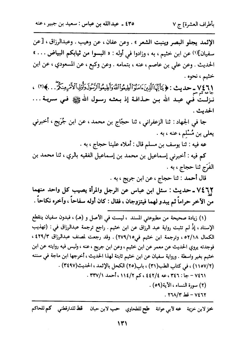 7461 - حَدِيثٌ (جا عه كم حم) : يَأَيُّهَا الَّذِينَ آمَنُوا أَطِيعُوا اللَّهَ وَأَطِيعُوا الرَّسُولَ وَأُولِي الأَمْرِ مِنْكُمْ [سورة: النساء، آية 59]- نَزَلَتْ فِي عَبْدِ اللَّهِ بْنِ حُذَافَةَ إِذْ بَعَثَهُ رَسُولُ اللَّهِ صَلَّى اللَّهُ عَلَيْهِ وَسَلَّمَ، فِي سَرِيَّةٍ. . . . الْحَدِيثَ. جا فِي الْجِهَادِ: ثنا الزَّعْفَرَانِيُّ، ثنا حَجَّاجُ بْنُ مُحَمَّدٍ، عَنِ ابْنِ جُرَيْجٍ، أَخْبَرَنِي يَعْلَى بْنُ مُسْلِمٍ، عَنْهُ، بِهِ. عه فِيهِ: ثنا يُوسُفُ بْنُ مُسْلِمٍ قَالَ: أَمْلاهُ عَلَيْنَا حَجَّاجٌ، بِهِ. كم فِيهِ: أَخْبَرَنِي إِسْمَاعِيلُ بْنُ مُحَمَّدِ بْنِ إِسْمَاعِيلَ الْفَقِيهُ بِالرَّيِّ، ثنا مُحَمَّدُ بْنُ الْفَرَجِ، ثنا حَجَّاجٌ، بِهِ. قَالَ أَحْمَدُ: ثنا حَجَّاجٌ، عَنِ ابْنِ جُرَيْجٍ، بِهِ.