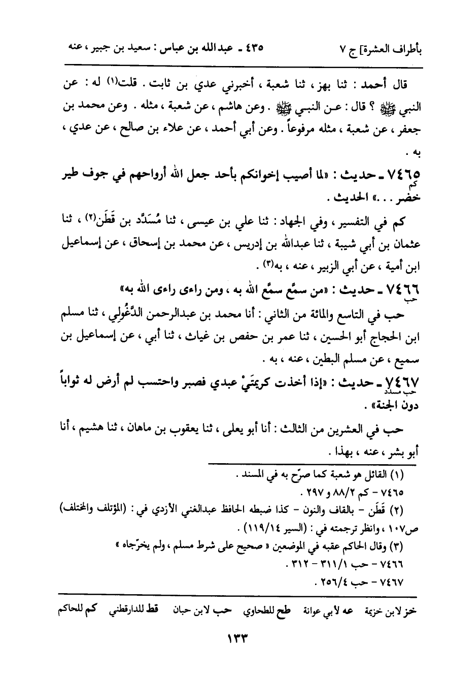 7465 - حَدِيثٌ (كم) : " لَمَّا أُصِيبَ إِخْوَانُكُمْ بِأُحُدٍ جَعَلَ اللَّهُ أَرْوَاحَهُمْ فِي جَوْفِ طَيْرٍ خُضْرٍ. . . . " الْحَدِيثَ. كم فِي التَّفْسِيرِ، وَفِي الْجِهَادِ: ثنا عَلِيُّ بْنُ عِيسَى، ثنا مُسَدَّدُ بْنُ قَطَنٍ، ثنا عُثْمَانُ بْنُ أَبِي شَيْبَةَ، ثنا عَبْدُ اللَّهِ بْنُ إِدْرِيسَ، عَنْ مُحَمَّدِ بْنِ إِسْحَاقَ، عَنْ إِسْمَاعِيلَ بْنِ أُمَيَّةَ، عَنْ أَبِي الزُّبَيْرِ، عَنْهُ، بِهِ.