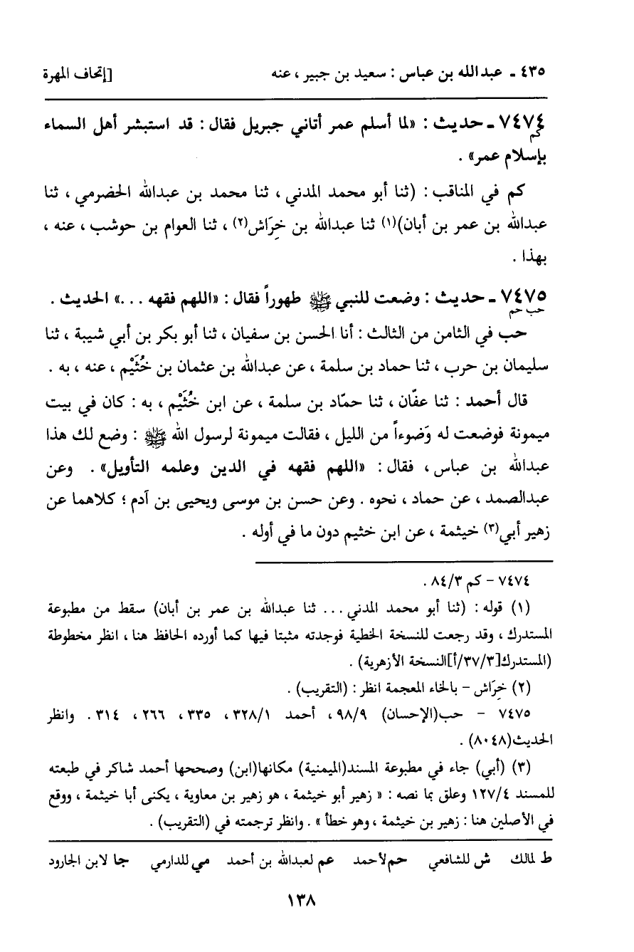 7475 - حَدِيثٌ (حب حم) : وَضَعْتُ لِلنَّبِيِّ صَلَّى اللَّهُ عَلَيْهِ وَسَلَّمَ، طَهُورًا فَقَالَ: " اللَّهُمَّ فَقِّهْهُ..... " الْحَدِيثَ. حب فِي الثَّامِنِ مِنَ الثَّالِثِ: أَنَّ الْحَسَنَ بْنَ سُفْيَانَ، ثنا أَبُو بَكْرِ بْنُ أَبِي شَيْبَةَ، ثنا سُلَيْمَانُ بْنُ حَرْبٍ، ثنا حَمَّادُ بْنُ سَلَمَةَ، عَنْ عَبْدِ اللَّهِ بْنِ عُثْمَانَ بْنِ خُثَيْمٍ، عَنْهُ، بِهِ. قَالَ أَحْمَدُ: ثنا عَفَّانُ، ثنا حَمَّادُ بْنُ سَلَمَةَ، عَنِ ابْنِ خُثَيْمٍ، بِهِ: كَانَ فِي بَيْتِ مَيْمُونَةَ فَوَضَعْتُ لَهُ وَضُوءًا مِنَ اللَّيْلِ، فَقَالَتْ مَيْمُونَةُ لِرَسُولِ اللَّهِ صَلَّى اللَّهُ عَلَيْهِ وَسَلَّمَ: وَضَعَ لَكَ هَذَا عَبْدُ اللَّهِ بْنُ عَبَّاسٍ، فَقَالَ: " اللَّهُمَّ فَقِّهْهُ فِي الدِّينِ وَعَلِّمْهُ التَّأْوِيلَ ". وَعَنْ عَبْدِ الصَّمَدِ، عَنْ حَمَّادٍ، نَحْوَهُ. وَعَنْ حَسَنِ بْنِ مُوسَى، وَيَحْيَى بْنِ آدَمَ؛ كِلاهُمَا عَنْ زُهَيْرِ بْنِ أَبِي خَيْثَمَةَ، عَنِ ابْنِ خُثَيْمٍ دُونَ مَا فِي أَوَّلِهِ.