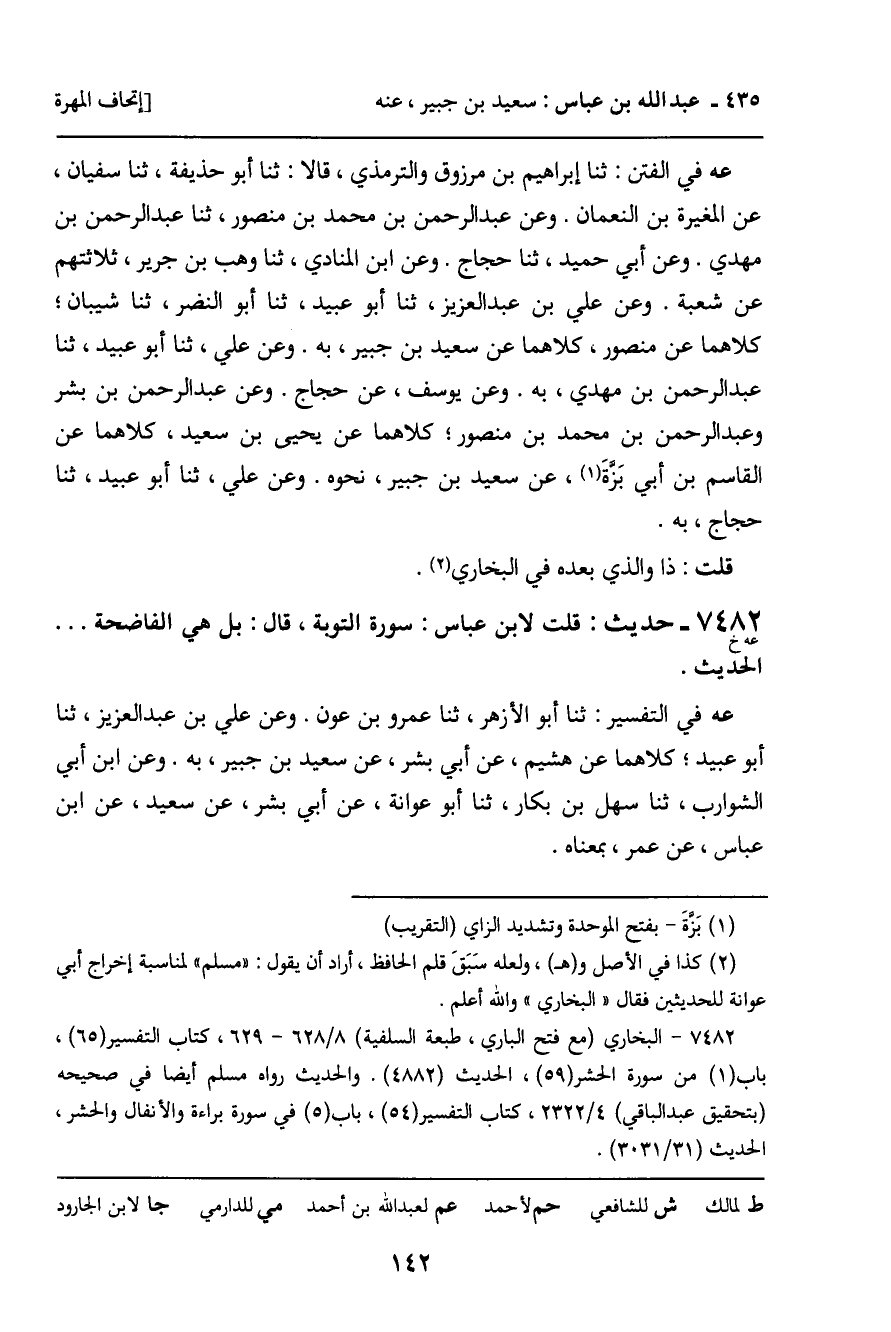 7482 - حَدِيثٌ (عه خ) : قُلْتُ لابْنِ عَبَّاسٍ: سُورَةُ التَّوْبَةِ - قَالَ: بَلْ هِيَ الْفَاضِحَةُ. . . . الْحَدِيثَ.