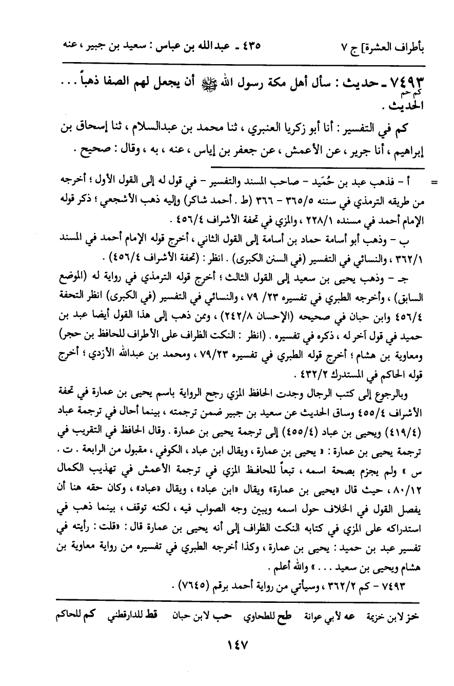 7493 - حَدِيثٌ (كم حم) : سَأَلَ أَهْلُ مَكَّةَ رَسُولَ اللَّهِ صَلَّى اللَّهُ عَلَيْهِ وَسَلَّمَ، أَنْ يَجْعَلَ لَهُمُ الصَّفَا ذَهَبًا. . . . الْحَدِيثَ. كم فِي التَّفْسِيرِ: أنا أَبُو زَكَرِيَّا الْعَنْبَرِيُّ، ثنا مُحَمَّدُ بْنُ عَبْدِ السَّلامِ، ثنا إِسْحَاقُ بْنُ إِبْرَاهِيمَ، أنا جَرِيرٌ، عَنِ الأَعْمَشِ، عَنْ جَعْفَرِ بْنِ إِيَاسٍ، عَنْهُ، بِهِ، وَقَالَ: صَحِيحٌ.