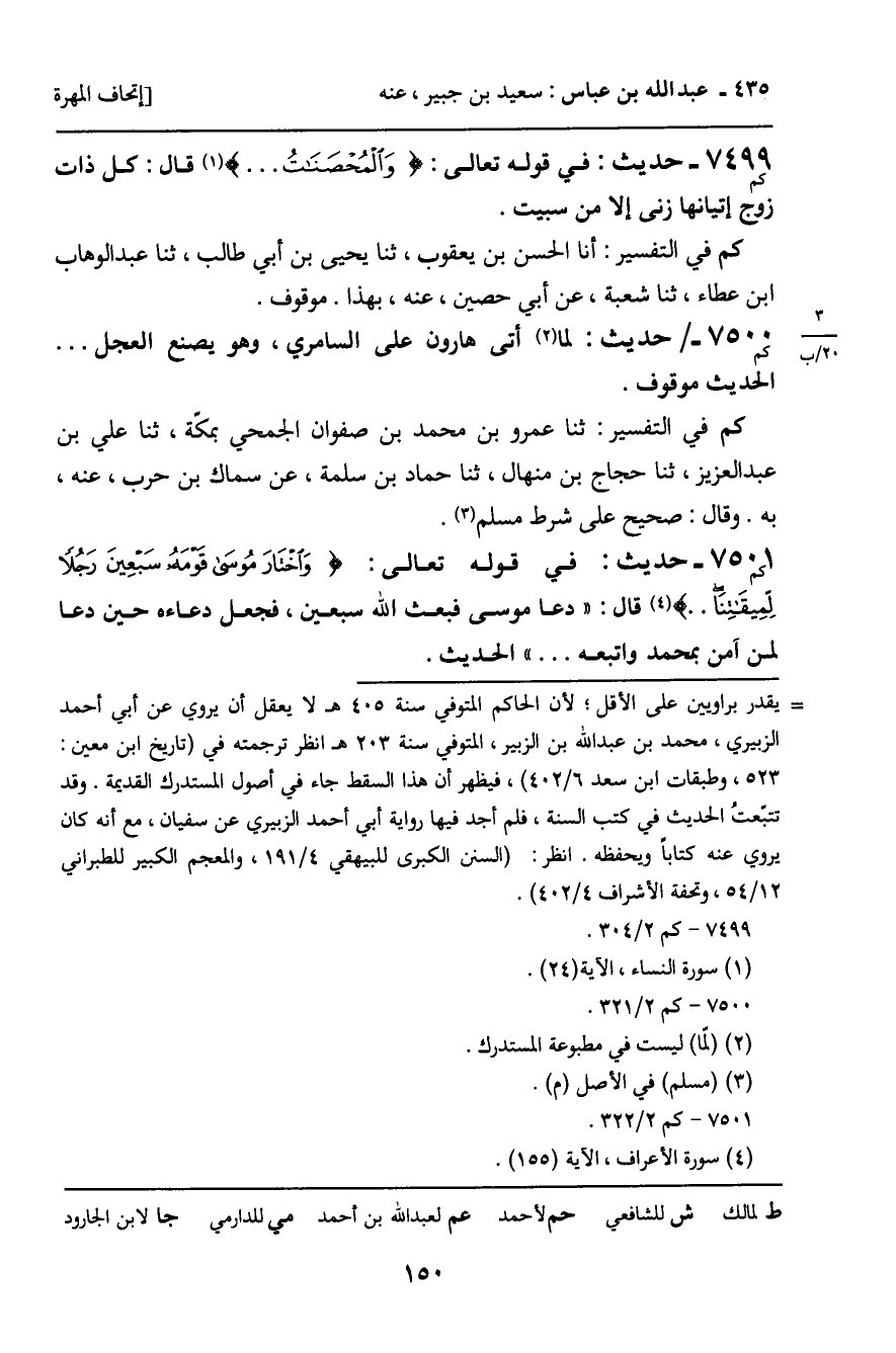 7499 - حَدِيثٌ (كم) : فِي قَوْلِهِ تَعَالَى: وَالْمُحْصَنَاتُ [سورة: النساء، آية 24] قَالَ: كُلُّ ذَاتِ زَوْجٍ إِتْيَانُهَا زِنًى إِلا مَنْ سُبِيَتْ. كم فِي التَّفْسِيرِ: أنا الْحَسَنُ بْنُ يَعْقُوبَ، ثنا يَحْيَى بْنُ أَبِي طَالِبٍ، ثنا عَبْدُ الْوَهَّابِ بْنُ عَطَاءٍ، ثنا شُعْبَةُ، عَنْ أَبِي حُصَيْنٍ، عَنْهُ، بِهَذَا. مَوْقُوفٌ.