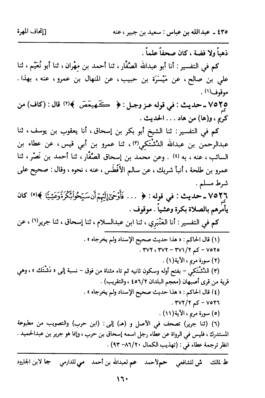 7525 - حَدِيثٌ (كم) : فِي قَوْلِهِ عَزَّ وَجَلَّ: كهيعص [سورة: مريم، آية 1] قَالَ: كَافٌ مِنْ كَرِيمٍ، وَهَا مِنْ هَادٍ. . . . الْحَدِيثَ. كم فِي التَّفْسِيرِ: ثنا الشَّيْخُ أَبُو بَكْرِ بْنُ إِسْحَاقَ، أنا يَعْقُوبُ بْنُ يُوسُفَ، ثنا عَبْدُ الرَّحْمَنِ بْنُ عَبْدِ اللَّهِ الدَّشْتَكِيُّ، ثنا عَمْرُو بْنُ أَبِي قَيْسٍ، عَنْ عَطَاءِ بْنِ السَّائِبِ، عَنْهُ، بِهِ. وَعَنْ مُحَمَّدِ بْنِ إِسْحَاقَ الصَّفَّارِ، ثنا أَحْمَدُ بْنُ نَصْرٍ، ثنا عَمْرُو بْنُ طَلْحَةَ، أنبأ شَرِيكٌ، عَنْ سَالِمٍ الأَفْطَسِ، عَنْهُ، نَحْوَهُ، وَقَالَ: صَحِيحٌ عَلَى شَرْطِ مُسْلِمٍ.
