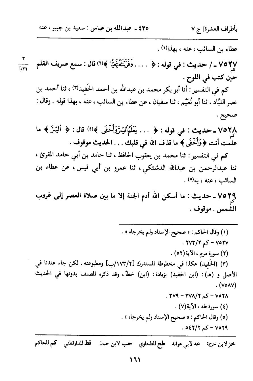 7527 - حَدِيثٌ (كم) : فِي قَوْلِهِ: وَقَرَّبْنَاهُ نَجِيًّا [سورة: مريم، آية 52] , قَالَ: سَمِعَ صَرِيفَ الْقَلَمِ حِينَ كَتَبَ فِي اللَّوْحِ. كم فِي التَّفْسِيرِ: أنا أَبُو بَكْرٍ مُحَمَّدُ بْنُ عَبْدِ اللَّهِ بْنِ أَحْمَدَ الْحَفِيدُ، ثنا أَحْمَدُ بْنُ نَصْرٍ اللَّبَّادُ، ثنا أَبُو نُعَيْمٍ، ثنا سُفْيَانُ، عَنْ عَطَاءِ بْنِ السَّائِبِ، عَنْهُ، بِهَذَا قَوْلَهُ، وَقَالَ: صَحِيحٌ.