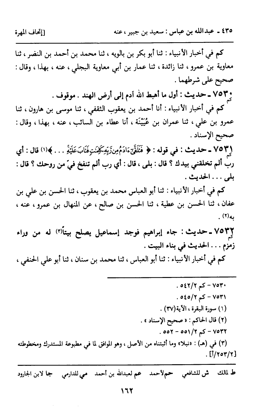 7530 - حَدِيثٌ (كم) : أَوَّلُ مَا أَهْبَطَ اللَّهُ آدَمَ إِلَى أَرْضِ الْهِنْدِ. مَوْقُوفٌ. كم فِي أَخْبَارِ الأَنْبِيَاءِ: أنا أَحْمَدُ بْنُ يَعْقُوبَ الثَّقَفِيُّ، ثنا مُوسَى بْنُ هَارُونَ، ثنا عَمْرُو بْنُ عَلِيٍّ، ثنا عِمْرَانُ بْنُ عُيَيْنَةَ، أنا عَطَاءُ بْنُ السَّائِبِ، عَنْهُ، بِهَذَا، وَقَالَ: صَحِيحُ الإِسْنَادِ.