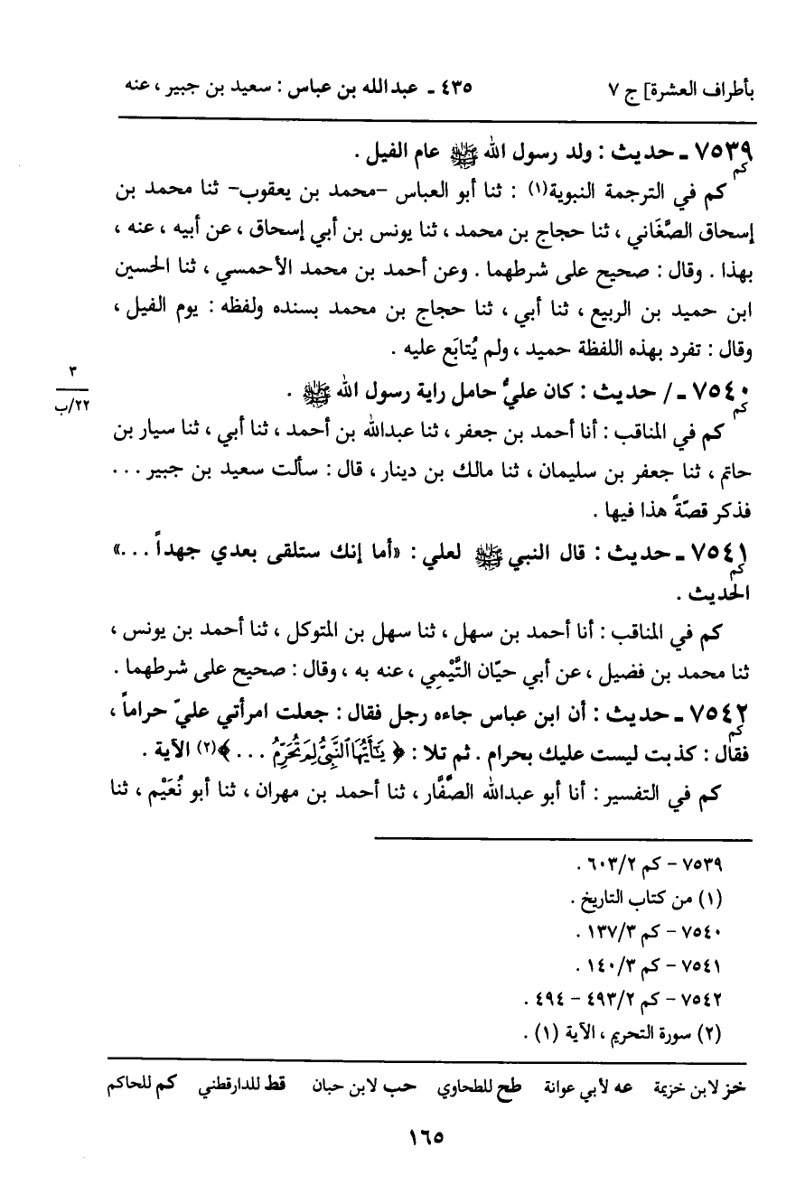 7539 - حَدِيثٌ (كم) : وُلِدَ رَسُولُ اللَّهِ صَلَّى اللَّهُ عَلَيْهِ وَسَلَّمَ، عَامَ الْفِيلِ. كم فِي التَّرْجَمَةِ النَّبَوِيَّةِ: ثنا أَبُو الْعَبَّاسِ، مُحَمَّدُ بْنُ يَعْقُوبَ، ثنا مُحَمَّدُ بْنُ إِسْحَاقَ الصَّغَانِيُّ، ثنا حَجَّاجُ بْنُ مُحَمَّدٍ، ثنا يُونُسُ بْنُ أَبِي إِسْحَاقَ، عَنْ أَبِيهِ، عَنْهُ، بِهَذَا. وَقَالَ: صَحِيحٌ عَلَى شَرْطِهِمَا. وَعَنْ أَحْمَدَ بْنِ مُحَمَّدٍ الأَحْمَسِيِّ، ثنا الْحُسَيْنُ بْنُ حُمَيْدِ بْنِ الرَّبِيعِ، ثنا أَبِي، ثنا حَجَّاجُ بْنُ مُحَمَّدٍ بِسَنَدِهِ وَلَفْظِهِ: يَوْمَ الْفِيلِ، وَقَالَ: تَفَرَّدَ بِهَذِهِ اللَّفْظَةِ حُمَيْدٌ، وَلَمْ يُتَابَعْ عَلَيْهِ.