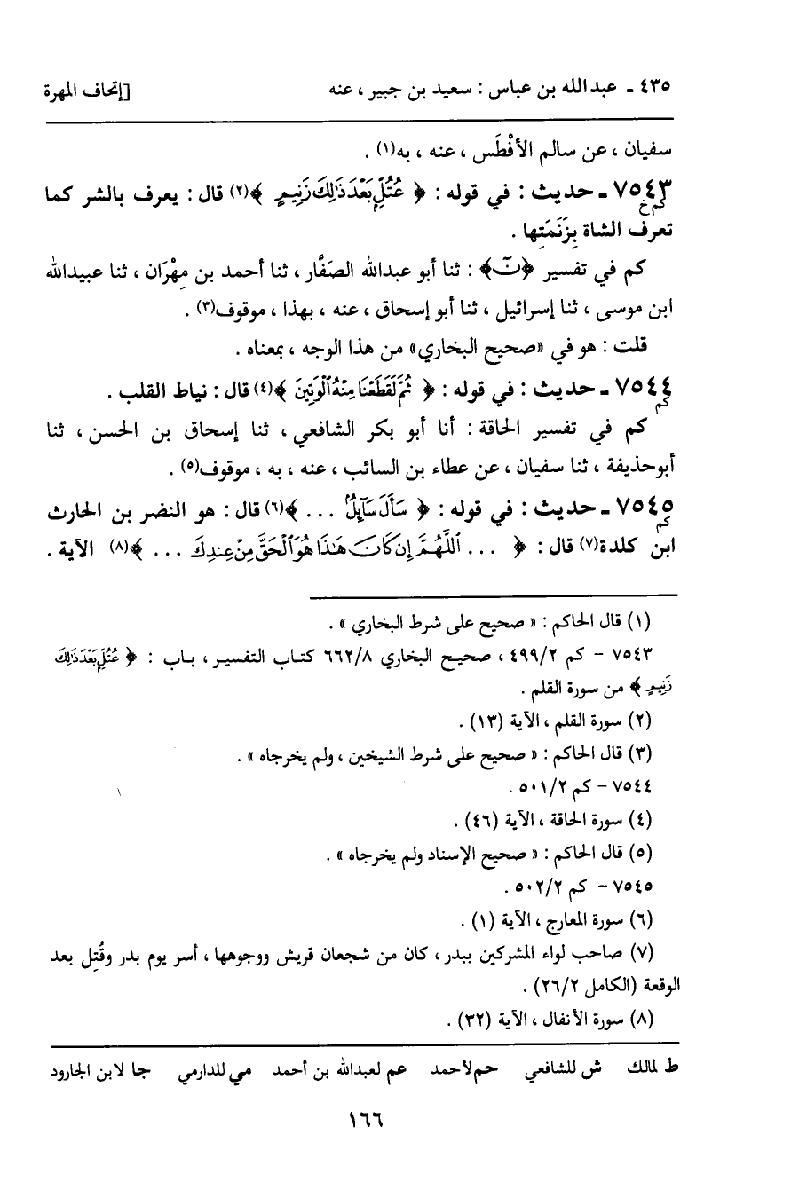 7543 - حَدِيثٌ (كم خ) : فِي قَوْلِهِ: عُتُلٍّ بَعْدَ ذَلِكَ زَنِيمٍ [سورة: القلم، آية 13] قَالَ: يُعْرَفُ بِالشَّرِّ كَمَا تُعْرَفُ الشَّاةُ بِزَنَمَتِهَا. كم فِي تَفْسِيرِ ن [سورة: القلم، آية 1] : ثنا أَبُو عَبْدِ اللَّهِ الصَّفَّارُ، ثنا أَحْمَدُ بْنُ مِهْرَانَ، ثنا عُبَيْدُ اللَّهِ بْنُ مُوسَى، ثنا إِسْرَائِيلُ، ثنا أَبُو إِسْحَاقَ، عَنْهُ، بِهَذَا، مَوْقُوفٌ. قُلْتُ: هُوَ فِي " صَحِيحِ الْبُخَارِيِّ " مِنْ هَذَا الْوَجْهِ، بِمَعْنَاهُ.