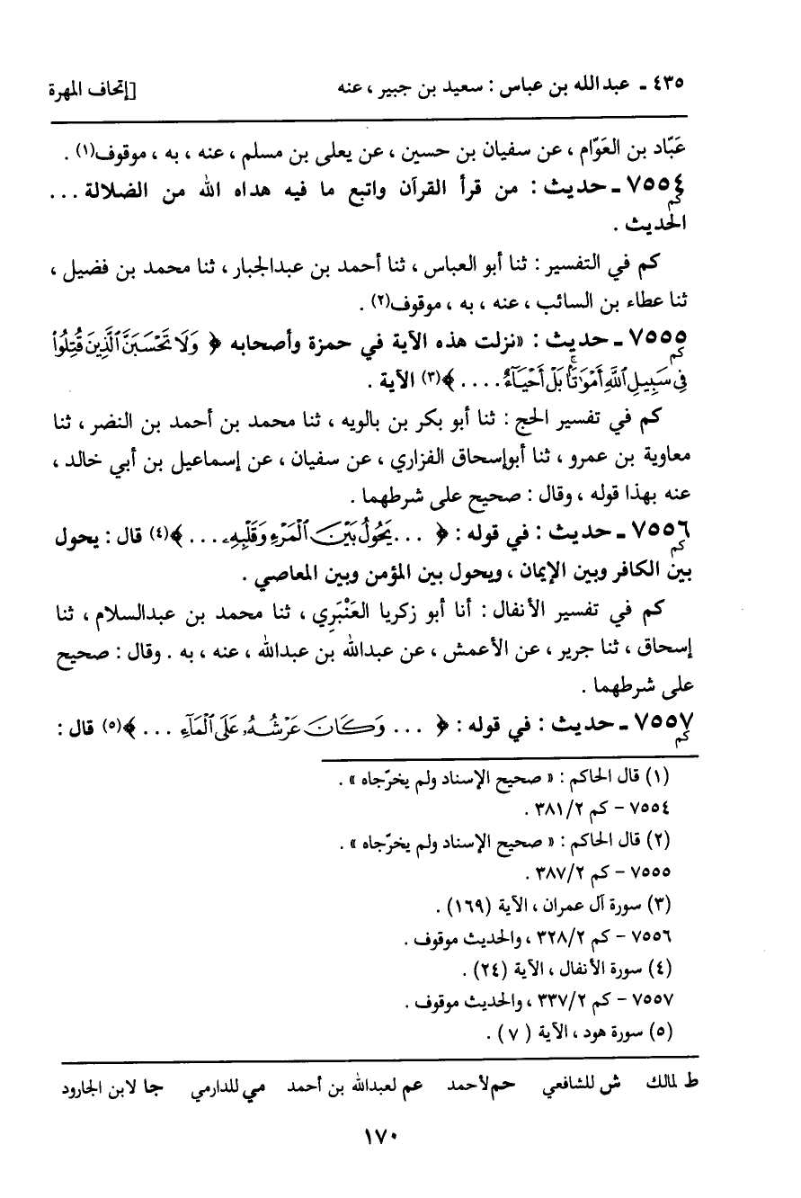 7555 - حَدِيثٌ (كم) : " نَزَلَتْ هَذِهِ الآيَةُ فِي حَمْزَةَ وَأَصْحَابِهِ وَلا تَحْسَبَنَّ الَّذِينَ قُتِلُوا فِي سَبِيلِ اللَّهِ أَمْوَاتًا بَلْ أَحْيَاءٌ [سورة: آل عمران، آية 169] الآيَةَ. كم فِي تَفْسِيرِ الْحَجِّ: ثنا أَبُو بَكْرِ بْنُ بَالَوَيْهِ، ثنا مُحَمَّدُ بْنُ أَحْمَدَ بْنِ النَّضْرِ، ثنا مُعَاوِيَةُ بْنُ عَمْرٍو، ثنا أَبُو إِسْحَاقَ الْفَزَارِيُّ، عَنْ سُفْيَانَ، عَنْ إِسْمَاعِيلَ بْنِ أَبِي خَالِدٍ، عَنْهُ بِهَذَا قَوْلَهُ، وَقَالَ: صَحِيحٌ عَلَى شَرْطِهِمَا.