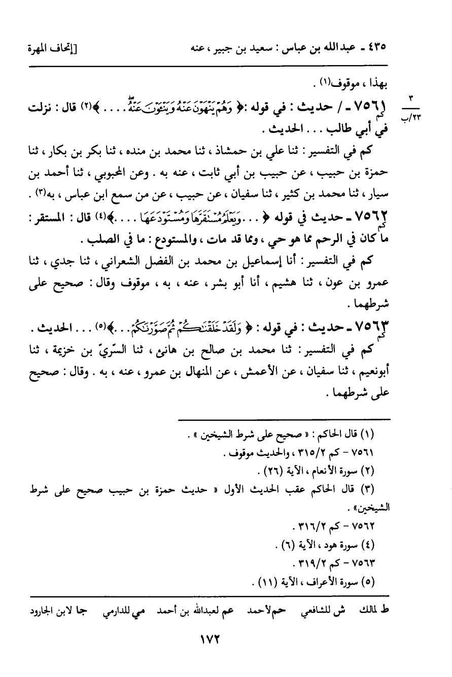 7561 - حَدِيثٌ (كم) : فِي قَوْلِهِ: وَهُمْ يَنْهَوْنَ عَنْهُ وَيَنْأَوْنَ عَنْهُ [سورة: الأنعام، آية 26] قَالَ: نَزَلَتْ فِي أَبِي طَالِبٍ. . . . الْحَدِيثَ. كم فِي التَّفْسِيرِ: ثنا عَلِيُّ بْنُ حَمْشَاذَ، ثنا مُحَمَّدُ بْنُ مَنْدَهْ، ثنا بَكْرُ بْنُ بَكَّارٍ، ثنا حَمْزَةُ بْنُ حَبِيبٍ، عَنْ حَبِيبِ بْنِ أَبِي ثَابِتٍ، عَنْهُ، بِهِ. وَعَنِ الْمَحْبُوبِيِّ، ثنا أَحْمَدُ بْنُ سَيَّارٍ، ثنا مُحَمَّدُ بْنُ كَثِيرٍ، ثنا سُفْيَانُ، عَنْ حَبِيبٍ، عَنْ مَنْ سَمِعَ ابْنَ عَبَّاسٍ، بِهِ.