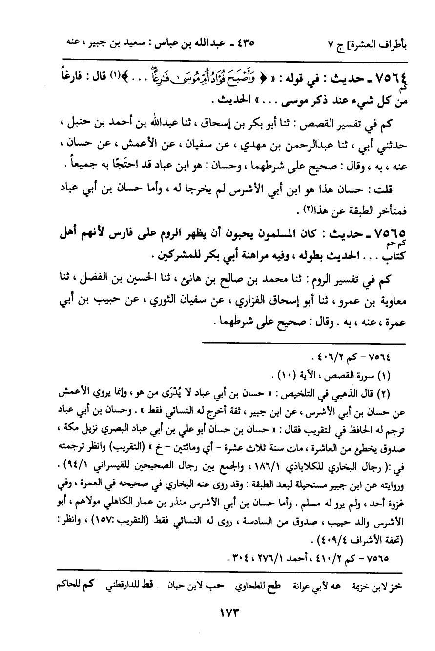 7564 - حَدِيثٌ (كم) : فِي قَوْلِهِ: وَأَصْبَحَ فُؤَادُ أُمِّ مُوسَى فَارِغًا [سورة: القصص، آية 10] قَالَ: فَارِغًا مِنْ كُلِّ شَيْءٍ عِنْدَ ذِكْرِ مُوسَى. . . . " الْحَدِيثَ. كم فِي تَفْسِيرِ الْقَصَصِ: ثنا أَبُو بَكْرِ بْنُ إِسْحَاقَ، ثنا عَبْدُ اللَّهِ بْنُ أَحْمَدَ بْنِ حَنْبَلٍ، حَدَّثَنِي أَبِي، ثنا عَبْدُ الرَّحْمَنِ بْنُ مَهْدِيٍّ، عَنْ سُفْيَانَ، عَنِ الأَعْمَشِ، عَنْ حَسَّانٍ، عَنْهُ، بِهِ، وَقَالَ: صَحِيحٌ عَلَى شَرْطِهِمَا، وَحَسَّانٌ: هُوَ ابْنُ عَبَّادٍ قَدِ احْتَجَّا بِهِ جَمِيعًا. قُلْتُ: حَسَّانٌ هَذَا هُوَ ابْنُ أَبِي الأَشْرَسِ لَمْ يُخَرِّجَا لَهُ، وَأَمَّا حَسَّانُ بْنُ أَبِي عَبَّادٍ فَمُتَأَّخِرُّ الطَّبَقَةِ عَنْ هَذَا.