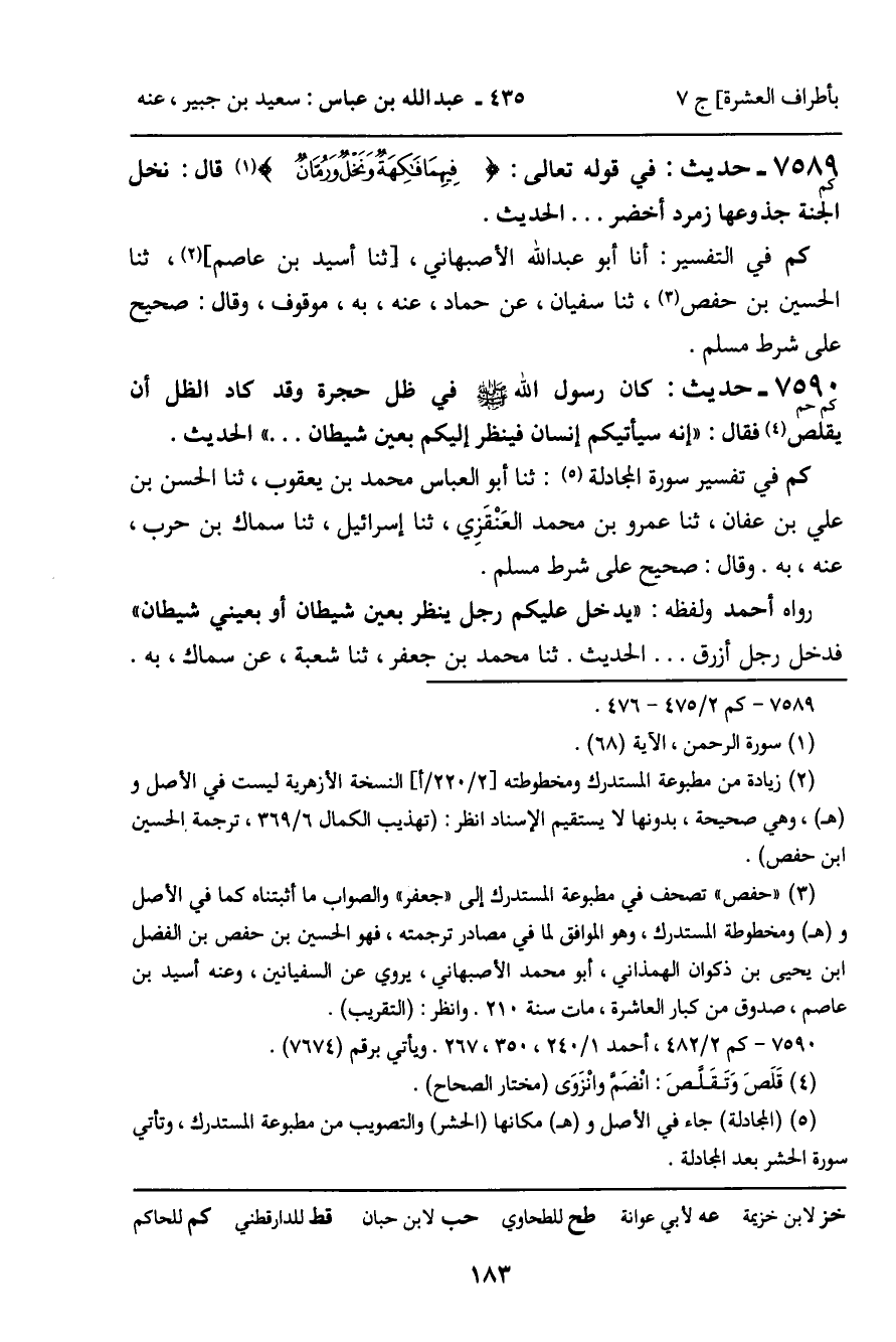 7590 - حَدِيثٌ (كم حم) : كَانَ رَسُولُ اللَّهِ صَلَّى اللَّهُ عَلَيْهِ وَسَلَّمَ، فِي ظِلِّ حُجْرَةٍ وَقَدْ كَادَ الظِّلُّ أَنْ يَقْلِصَ فَقَالَ: " إِنَّهُ سَيَأْتِيكُمْ إِنْسَانٌ فَيَنْظُرُ إِلَيْكُمْ بِعَيْنِ شَيْطَانٍ. . . . الْحَدِيثَ. كم فِي تَفْسِيرِ سُورَةِ الْمُجَادَلَةِ: ثنا أَبُو الْعَبَّاسِ مُحَمَّدُ بْنُ يَعْقُوبَ، ثنا الْحَسَنُ بْنُ عَلِيِّ بْنِ عَفَّانَ، ثنا عَمْرُو بْنُ مُحَمَّدٍ الْعَنْقَزِيُّ، ثنا إِسْرَائِيلُ، ثنا سِمَاكُ بْنُ حَرْبٍ، عَنْهُ، بِهِ. وَقَالَ: صَحِيحٌ عَلَى شَرْطِ مُسْلِمٍ. رَوَاهُ أَحْمَدُ وَلَفْظُهُ: " يَدْخُلُ عَلَيْكُمْ رَجُلٌ يَنْظُرُ بِعَيْنِ شَيْطَانٍ أَوْ بِعَيْنَيْ شَيْطَانٍ ". فَدَخَلَ رَجُلٌ أَزْرَقُ........ الْحَدِيثَ. ثنا مُحَمَّدُ بْنُ جَعْفَرٍ، ثنا شُعْبَةُ، عَنْ سِمَاكٍ، بِهِ.