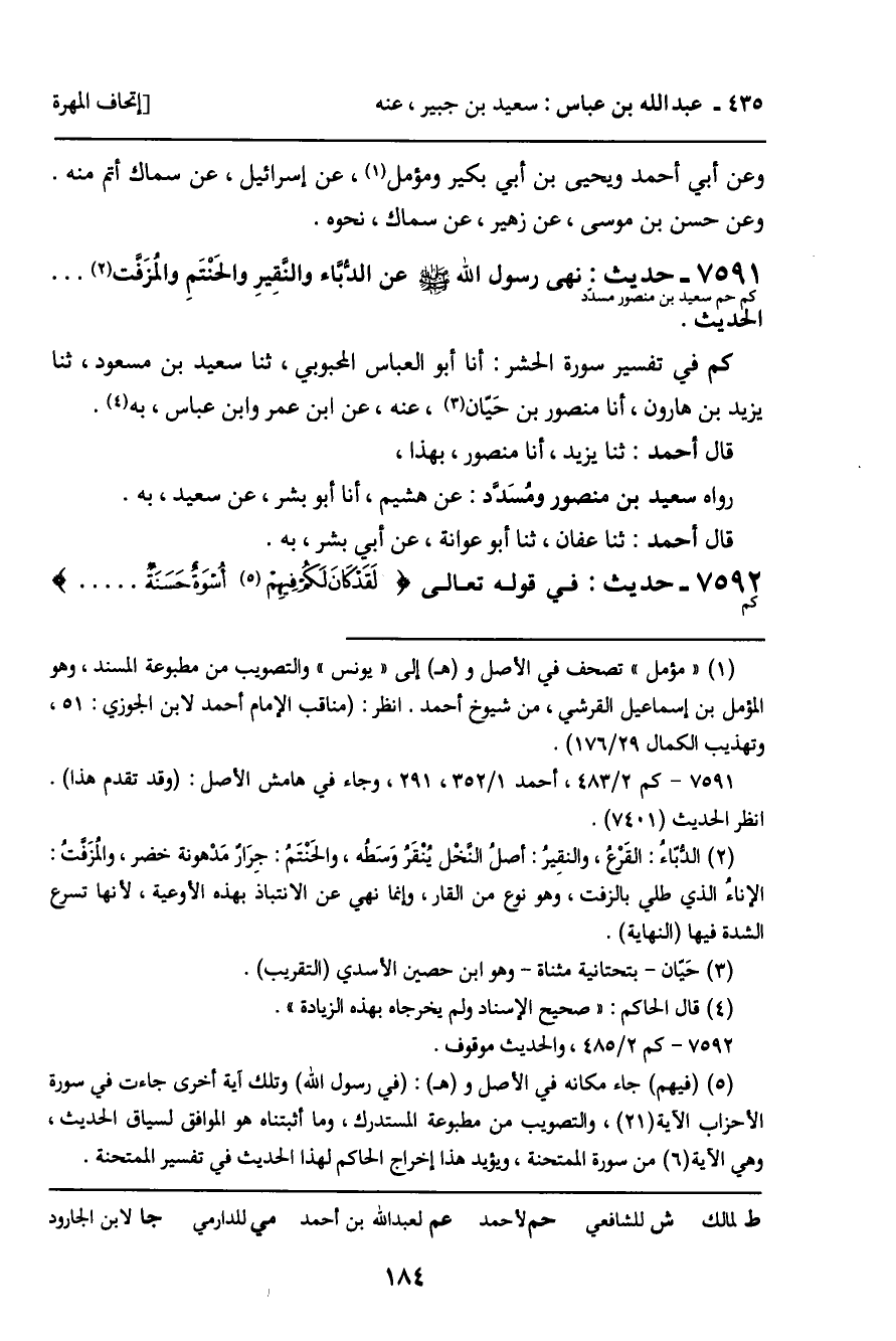 7591 - حَدِيثٌ (كم حم سعيد بن منصور مسدد) : نَهَى رَسُولُ اللَّهِ صَلَّى اللَّهُ عَلَيْهِ وَسَلَّمَ، عَنِ الدُّبَّاءِ وَالنَّقِيرِ وَالْحَنْتَمِ وَالْمُزَفَّتِ. . . . الْحَدِيثَ. كم فِي تَفْسِيرِ سُورَةِ الْحَشْرِ: أنا أَبُو الْعَبَّاسِ الْمَحْبُوبِيُّ، ثنا سَعِيدُ بْنُ مَسْعُودٍ، ثنا يَزِيدُ بْنُ هَارُونَ، أنا مَنْصُورُ بْنُ حَيَّانَ، عَنْهُ، عَنِ ابْنِ عُمَرَ، وَابْنِ عَبَّاسٍ، بِهِ. قَالَ أَحْمَدُ: ثنا يَزِيدُ، أنا مَنْصُورٌ، بِهَذَا. رَوَاهُ سَعِيدُ بْنُ مَنْصُورٍ، وَمُسَدَّدٌ: عَنْ هُشَيْمٍ، أنا أَبُو بِشْرٍ، عَنْ سَعِيدٍ، بِهِ. قَالَ أَحْمَدُ: ثنا عَفَّانُ، ثنا أَبُو عَوَانَةَ، عَنْ أَبِي بِشْرٍ، بِهِ.
