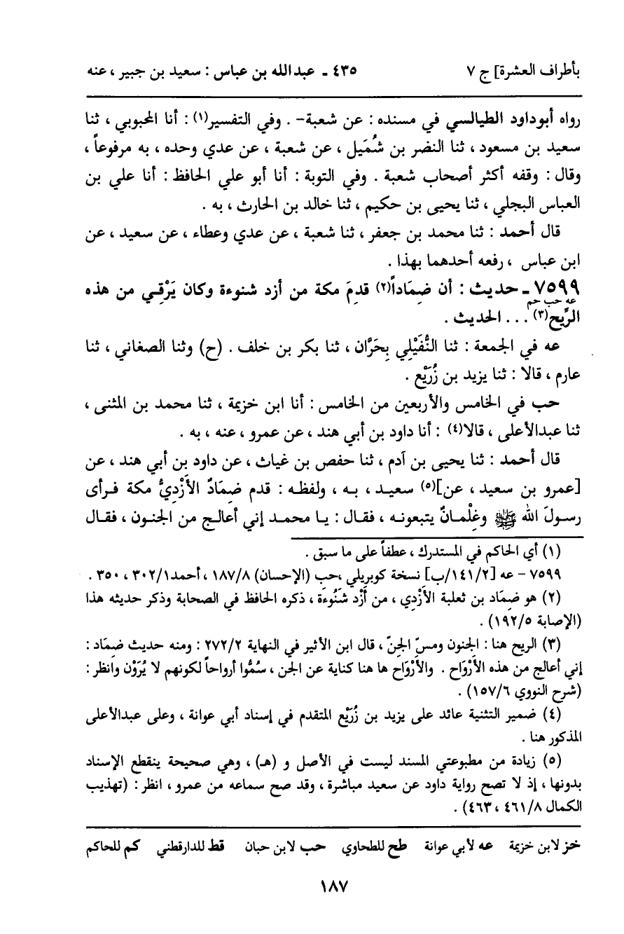 7599 - حَدِيثٌ (عه حب حم) : أَنَّ ضِمَادًا قَدِمَ مَكَّةَ مِنْ أَزْدِ شَنُوءَةَ وَكَانَ يَرْقِي مِنْ هَذِهِ الرِّيحِ. . . . الْحَدِيثَ. عه فِي الْجُمْعَةِ: ثنا النُّفَيْلِيُّ بِحَرَّانَ، ثنا بَكْرُ بْنُ خَلَفٍ. ح وثنا الصَّغَانِيُّ، ثنا عَارِمٌ قَالا: ثنا يَزِيدُ بْنُ زُرَيْعٍ. حب فِي الْخَامِسِ وَالأَرْبَعِينَ مِنَ الْخَامِسِ: أنا ابْنُ خُزَيْمَةَ، ثنا مُحَمَّدُ بْنُ الْمُثَنَّى، ثنا عَبْدُ الأَعْلَى، قَالا: أنا دَاوُدُ بْنُ أَبِي هِنْدٍ، عَنْ عَمْرٍو، عَنْهُ، بِهِ.
