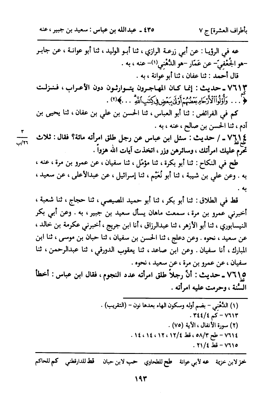 7614 - حَدِيثٌ (طح قط) : سُئِلَ ابْنُ عَبَّاسٍ عَنْ رَجُلٍ طَلَّقَ امْرَأَتَهُ مِائَةً؟ فَقَالَ: ثَلاثٌ تُحَرَّمُ عَلَيْكَ امْرَأَتُكَ، وَسَائِرُهُنَّ وِزْرٌ، اتَّخَذْتَ آيَاتِ اللَّهِ هُزُوًا. طح فِي النِّكَاحِ: ثنا أَبُو بَكْرَةَ، ثنا مُؤَمَّلٌ، ثنا سُفْيَانُ، عَنْ عَمْرِو بْنِ مُرَّةَ، عَنْهُ، بِهِ. وَعَنْ عَلِيِّ بْنِ شَيْبَةَ، ثنا أَبُو نُعَيْمٍ، ثنا إِسْرَائِيلُ، عَنْ عَبْدِ الأَعْلَى، عَنْ سَعِيدٍ، بِهِ. قط فِي الطَّلاقِ: ثنا أَبُو بَكْرٍ، ثنا أَبُو حُمَيْدٍ الْمِصِّيصِيُّ، ثنا حَجَّاجٌ، ثنا شُعْبَةُ، أَخْبَرَنِي عَمْرُو بْنُ مُرَّةَ، سَمِعْتُ مَاهَانَ يَسْأَلُ سَعِيدَ بْنَ جُبَيْرٍ، بِهِ. وَعَنْ أَبِي بَكْرٍ النَّيْسَابُورِيِّ، ثنا أَبُو الأَزْهَرِ، ثنا عَبْدُ الرَّزَّاقِ، أنا ابْنُ جُرَيْجٍ، أَخْبَرَنِي عِكْرِمَةُ بْنُ خَالِدٍ، عَنْ سَعِيدٍ، نَحْوَهُ. وَعَنْ دَعْلَجٍ، ثنا الْحَسَنُ بْنُ سُفْيَانَ، ثنا حِبَّانُ بْنُ مُوسَى، ثنا ابْنُ الْمُبَارَكِ، أنا سُفْيَانُ. وَعَنِ ابْنِ صَاعِدٍ، ثنا يَعْقُوبُ الدَّوْرَقِيُّ، ثنا عَبْدُ الرَّحْمَنِ، ثنا سُفْيَانُ، عَنْ عَمْرِو بْنِ مُرَّةَ، عَنْ سَعِيدٍ، نَحْوَهُ.