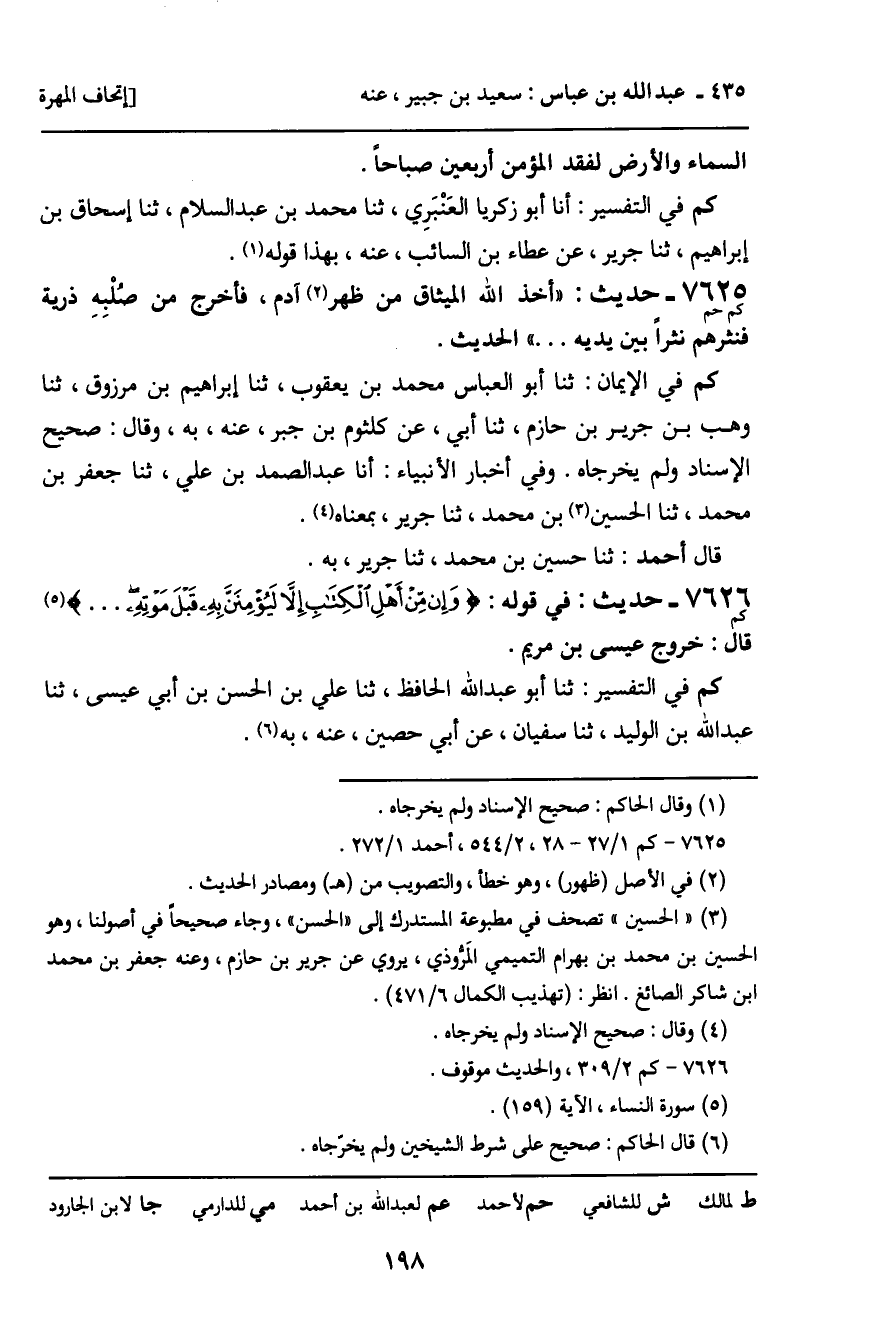7625 - حَدِيثٌ (كم حم) : " أَخَذَ اللَّهُ الْمِيثَاقَ مِنْ ظَهْرِ آدَمَ، فَأَخْرَجَ مِنْ صُلْبِهِ ذُرِّيَّةً فَنَثَرَهُمْ نَثْرًا بَيْنَ يَدَيْهِ. . . . " الْحَدِيثَ. كم فِي الإِيمَانِ: ثنا أَبُو الْعَبَّاسِ مُحَمَّدُ بْنُ يَعْقُوبَ، ثنا إِبْرَاهِيمُ بْنُ مَرْزُوقٍ، ثنا وَهْبُ بْنُ جَرِيرِ بْنِ حَازِمٍ، ثنا أَبِي، عَنْ كُلْثُومِ بْنِ جَبْرٍ، عَنْهُ، بِهِ، وَقَالَ: صَحِيحُ الإِسْنَادِ وَلَمْ يُخَرِّجَاهُ. وَفِي أَخْبَارِ الأَنْبِيَاءِ: أنا عَبْدُ الصَّمَدِ بْنُ عَلِيٍّ، ثنا جَعْفَرُ بْنُ مُحَمَّدٍ، ثنا الْحُسَيْنُ بْنُ مُحَمَّدٍ، ثنا جَرِيرٌ، بِمَعْنَاهُ. قَالَ أَحْمَدُ: ثنا حُسَيْنُ بْنُ مُحَمَّدٍ، ثنا جَرِيرٌ، بِهِ.