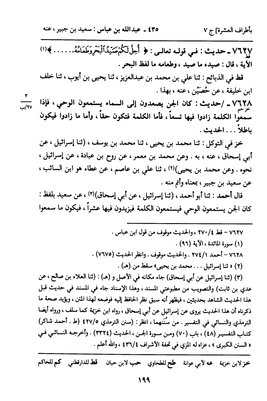 7628 - حَدِيثٌ (خز حم) : كَانَ الْجِنُّ يَصْعَدُونَ إِلَى السَّمَاءِ يَسْتَمِعُونَ الْوَحْيَ، فَإِذَا سَمِعُوا الْكَلِمَةَ زَادُوا فِيهَا تِسْعًا، فَأَمَّا الْكَلِمَةُ فَتَكُونُ حَقًّا، وَأَمَّا مَا زَادُوا فَيَكُونُ بَاطِلا. . . . الْحَدِيثَ. خز فِي التَّوَكُّلِ: ثنا مُحَمَّدُ بْنُ يَحْيَى، ثنا مُحَمَّدُ بْنُ يُوسُفَ، ثنا إِسْرَائِيلُ، عَنْ أَبِي إِسْحَاقَ، عَنْهُ، بِهِ. وَعَنْ مُحَمَّدِ بْنِ مَعْمَرٍ، عَنْ رَوْحِ بْنِ عُبَادَةَ، عَنْ إِسْرَائِيلَ، نَحْوَهُ. وَعَنْ مُحَمَّدِ بْنِ يَحْيَى، ثنا عَلِيُّ بْنُ عَاصِمٍ، عَنْ عَطَاءٍ هُوَ ابْنُ السَّائِبِ، عَنْ سَعِيدِ بْنِ جُبَيْرٍ، بِمَعْنَاهُ وَأَتَمَّ مِنْهُ. قَالَ أَحْمَدُ: ثنا أَبُو أَحْمَدَ، ثنا إِسْرَائِيلُ، عَنْ أَبِي إِسْحَاقَ، عَنْ سَعِيدٍ بِلَفْظِ: كَانَ الْجِنُّ يَسْتَمِعُونَ الْوَحْيَ فَيَسْتَمِعُونَ الْكَلِمَةَ فَيَزِيدُونَ فِيهَا عَشْرًا، فَيَكُونُ مَا سَمِعُوا