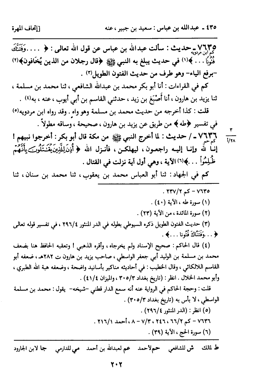 7635 - حَدِيثٌ (كم ابن مردويه) : سَأَلْتُ عَبْدَ اللَّهِ بْنَ عَبَّاسٍ عَنْ قَوْلِ اللَّهِ تَعَالَى: وَفَتَنَّاكَ فُتُونًا [سورة: طه، آية 40] فِي حَدِيثٍ يَبْلُغُ بِهِ النَّبِيَّ صَلَّى اللَّهُ عَلَيْهِ وَسَلَّمَ (قَالَ رَجُلانِ مِنَ الَّذِينَ يَخَافُونَ) ، بِرَفْعِ الْيَاءِ، وَهُوَ طَرَفٌ مِنْ حَدِيثِ الْفُتُونِ الطَّوِيلِ. كم فِي الْقِرَاءَاتِ: أنا أَبُو بَكْرٍ مُحَمَّدُ بْنُ عَبْدِ اللَّهِ الشَّافِعِيُّ، ثنا مُحَمَّدُ بْنُ مَسْلَمَةَ، ثنا يَزِيدُ بْنُ هَارُونَ، أنا أَصْبَغُ بْنُ زَيْدٍ، حَدَّثَنِي الْقَاسِمُ بْنُ أَبِي أَيُّوبَ، عَنْهُ، بِهِ. قُلْتُ: كَذَا أَخْرَجَهُ مِنْ حَدِيثِ مُحَمَّدِ بْنِ مَسْلَمَةَ وَهُوَ وَاهٍ. وَقَدْ رَوَاهُ ابْنُ مَرْدَوَيْهِ فِي تَفْسِيرِ طه مِنْ طَرِيقٍ عَنْ يَزِيدَ بْنِ هَارُونَ، صَحِيحَةٍ، وَسَاقَهُ مُطَوَّلا.