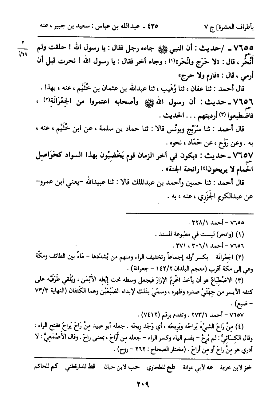 7656 - حَدِيثٌ (حم) : أَنَّ رَسُولَ اللَّهِ صَلَّى اللَّهُ عَلَيْهِ وَسَلَّمَ، وَأَصْحَابُهُ اعْتَمَرُوا مِنَ الْجِعْرَانَةِ، فَاضْطَبَعُوا أَرْدِيَتَهُمْ ... الْحَدِيثَ. قَالَ أَحْمَدُ: ثنا سُرَيْجٌ، وَيُونُسُ قَالا: ثنا حَمَّادُ بْنُ سَلَمَةَ، عَنِ ابْنِ خُثَيْمٍ، عَنْهُ، بِهِ. وَعَنْ رَوْحٍ، عَنْ حَمَّادٍ، نَحْوَهُ.