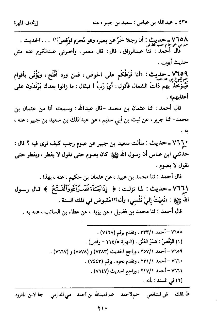 7659 - حَدِيثٌ (حم كم خ مي عه حب) : " أَنَا فَرَطُكُمْ عَلَى الْحَوْضِ، فَمَنْ وَرَدَ أَفْلَحَ، وَيُؤْتَى بِأَقْوَامٍ فَيُؤْخَذُ بِهِمْ ذَاتَ الشِّمَالِ فَأَقُولُ: أَيْ رَبِّ فَيُقَالُ: مَا زَالُوا بَعْدَكَ يَرْتَدُّونَ عَلَى أَعْقَابِهِمْ ". قَالَ أَحْمَدُ: ثنا عُثْمَانُ بْنُ مُحَمَّدٍ، قَالَ عَبْدُ اللَّهِ: وَسَمِعْتُهُ أَنَا مِنْ عُثْمَانَ بْنِ مُحَمَّدٍ، ثنا جَرِيرٌ، عَنْ لَيْثِ بْنِ أَبِي سُلَيْمٍ، عَنْ عَبْدِ الْمَلِكِ بْنِ سَعِيدِ بْنِ جُبَيْرٍ، عَنْهُ، بِهِ.