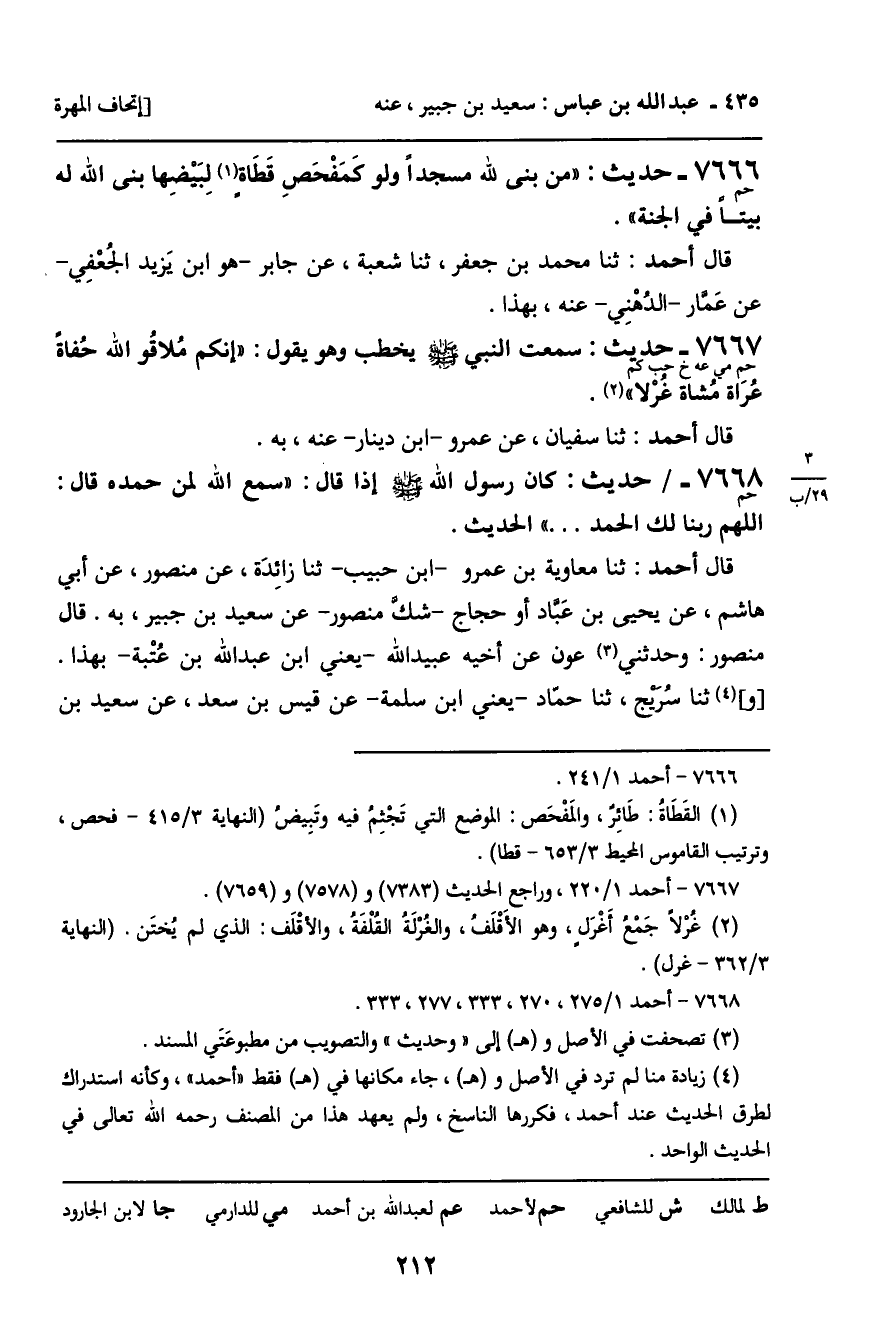 7668 - حَدِيثٌ (حم) : كَانَ رَسُولُ اللَّهِ صَلَّى اللَّهُ عَلَيْهِ وَسَلَّمَ، إِذَا قَالَ: " سَمِعَ اللَّهُ لِمَنْ حَمِدَهُ , قَالَ: اللَّهُمَّ رَبَّنَا لَكَ الْحَمْدُ ... " الْحَدِيثَ. قَالَ أَحْمَدُ: ثنا مُعَاوِيَةُ بْنُ عَمْرِو بْنِ حَبِيبٍ، ثنا زَائِدَةُ، عَنْ مَنْصُورٍ، عَنْ أَبِي هَاشِمٍ، عَنْ يَحْيَى بْنِ عَبَّادٍ أَوْ حَجَّاجٍ، شَكَّ مَنْصُورٌ، عَنْ سَعِيدِ بْنِ جُبَيْرٍ، بِهِ. قَالَ مَنْصُورٌ: وَحَدَّثَنِي عَوْنٌ، عَنْ أَخِيهِ عُبَيْدِ اللَّهِ، يَعْنِي ابْنَ عَبْدِ اللَّهِ بْنِ عُتْبَةَ، بِهَذَا. وثنا سُرَيْجٌ، ثنا حَمَّادٌ، يَعْنِي ابْنَ سَلَمَةَ، عَنْ قَيْسِ بْنِ سَعْدٍ، عَنْ سَعِيدِ بْنِ
