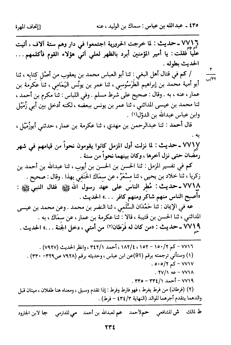 7716 - حَدِيثٌ (كم حم) : لَمَّا خَرَجَتِ الْحَرُورِيَّةُ اجْتَمَعُوا فِي دَارٍ وَهُمْ سِتَّةُ آلافٍ، أَتَيْتُ عَلِيًّا فَقُلْتُ: يَا أَمِيرَ الْمُؤْمِنِينَ أَبْرِدْ بِالظُّهْرِ لَعَلِّي آتِيَ هَؤُلاءِ الْقَوْمَ فَأُكَلِّمَهُمْ ... الْحَدِيثَ بِطُولِهِ. كم فِي قِتَالِ أَهْلِ الْبَغْيِ: ثنا أَبُو الْعَبَّاسِ مُحَمَّدُ بْنُ يَعْقُوبَ مِنْ أَصْلِ كِتَابِهِ، ثنا أَبُو أُمَيَّةَ مُحَمَّدُ بْنُ إِبْرَاهِيمَ الطَّرَسُوسِيُّ، ثنا عُمَرُ بْنُ يُونُسَ الْيَمَامِيُّ، ثنا عِكْرِمَةُ بْنُ عَمَّارٍ، عَنْهُ، بِهِ. وَقَالَ: صَحِيحٌ عَلَى شَرْطِ مُسْلِمٍ. وَفِي اللِّبَاسِ: ثنا مُكْرَمُ بْنُ أَحْمَدَ، ثنا مُحَمَّدُ بْنُ عِيسَى الْمَدَائِنِيُّ، ثنا عُمَرُ بْنُ يُونُسَ بِبَعْضِهِ، لَكِنَّهُ أَدْخَلَ بَيْنَ أَبِي زُمَيْلٍ وَابْنِ عَبَّاسِ عَبْدَ اللَّهِ بْنَ الدُّؤَلِ. قَالَ أَحْمَدُ: ثنا عَبْدُ الرَّحْمَنِ بْنُ مَهْدِيٍّ، ثنا عِكْرِمَةُ بْنُ عَمَّارٍ، حَدَّثَنِي أَبُو زُمَيْلٍ، بِهِ.