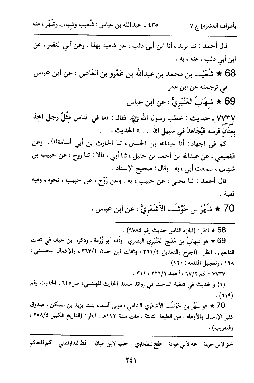 7737 - حَدِيثٌ (كم حم) : خَطَبَ رَسُولُ اللَّهِ صَلَّى اللَّهُ عَلَيْهِ وَسَلَّمَ، فَقَالَ: " مَا فِي النَّاسِ مِثْلُ رَجُلٍ آخِذٌ بِعِنَانِ فَرَسِهِ فَيُجَاهِدُ فِي سَبِيلِ اللَّهِ ... " الْحَدِيثَ. كم فِي الْجِهَادِ: أنا عَبْدُ اللَّهِ بْنُ الْحُسَيْنِ، ثنا الْحَارِثُ بْنُ أَبِي أُسَامَةَ. وَعَنِ الْقَطِيعِيِّ، عَنْ عَبْدِ اللَّهِ بْنِ أَحْمَدَ بْنِ حَنْبَلٍ، ثنا أَبِي، قَالَ: ثنا رَوْحٌ عَنْ حَبِيبِ بْنِ شِهَابٍ، سَمِعْتُ أَبِي، بِهِ. وَقَالَ: صَحِيحُ الإِسْنَادِ. قَالَ أَحْمَدُ: ثنا يَحْيَى، عَنْ حَبِيبٍ، بِهِ. وَعَنْ رَوْحٍ، عَنْ حَبِيبٍ، نَحْوَهُ، وَفِيهِ قِصَّةٌ.