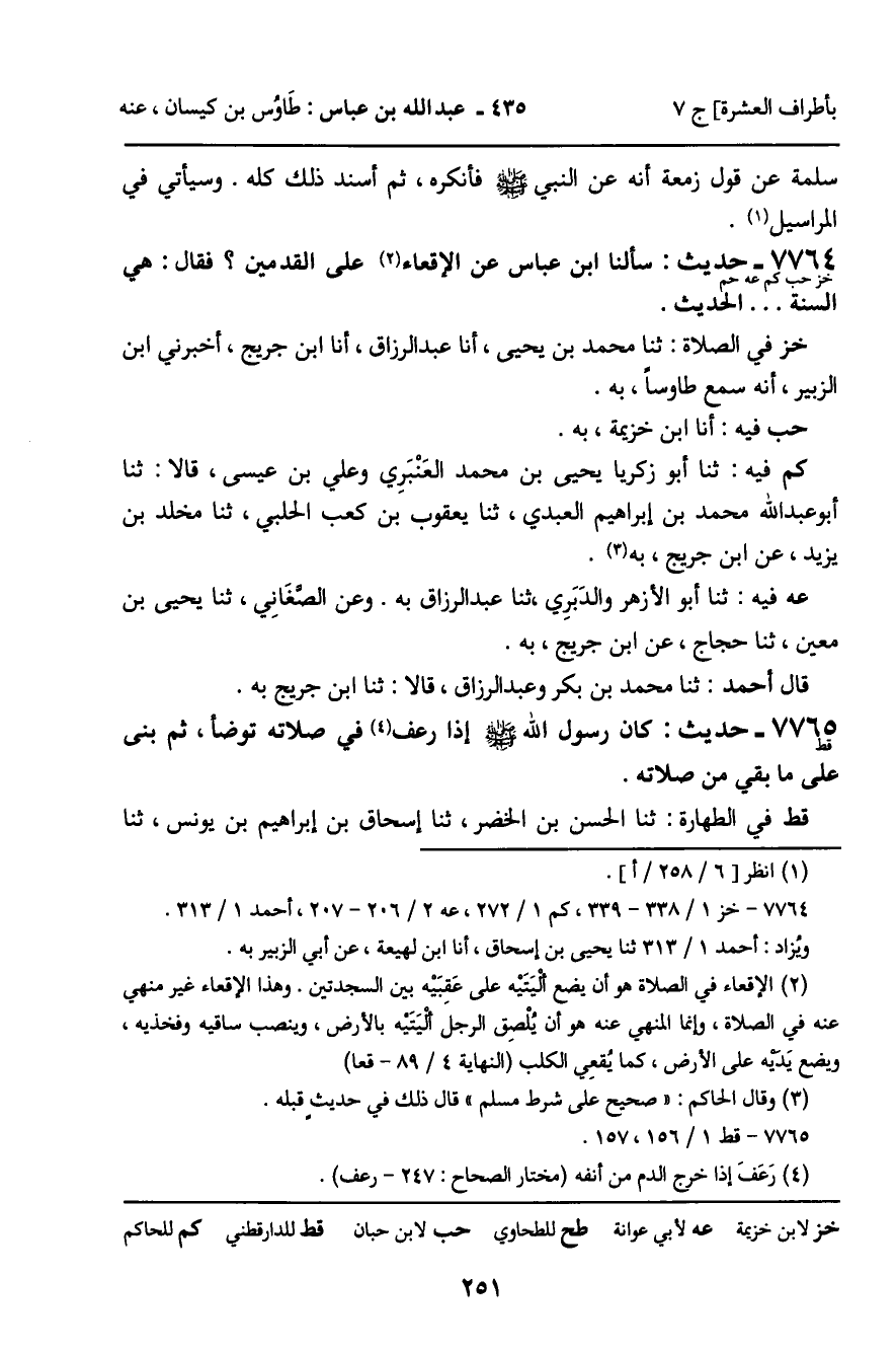 7764 - حَدِيثٌ (خز حب كم عه حم) : سَأَلْنَا ابْنَ عَبَّاسٍ عَنِ الإِقْعَاءِ عَلَى الْقَدَمَيْنِ؟ فَقَالَ: هِيَ السُّنَّةُ ... الْحَدِيثَ. خز فِي الصَّلاةِ: ثنا مُحَمَّدُ بْنُ يَحْيَى، أنا عَبْدُ الرَّزَّاقِ، أنا ابْنُ جُرَيْجٍ، أَخْبَرَنِي ابْنُ الزُّبَيْرِ، أَنَّهُ سَمِعَ طَاوُسًا، بِهِ. حب فِيهِ: أنا ابْنُ خُزَيْمَةَ، بِهِ. كم فِيهِ: ثنا أَبُو زَكَرِيَّا يَحْيَى بْنُ مُحَمَّدٍ الْعَنْبَرِيُّ، وَعَلِيُّ بْنُ عِيسَى، قَالا: ثنا أَبُو عَبْدِ اللَّهِ مُحَمَّدُ بْنُ إِبْرَاهِيمَ الْعَبْدِيُّ، ثنا يَعْقُوبُ بْنُ كَعْبٍ الْحَلَبِيُّ، ثنا مَخْلَدُ بْنُ يَزِيدَ، عَنِ ابْنِ جُرَيْجٍ، بِهِ. عه فِيهِ: ثنا أَبُو الأَزْهَرِ، وَالدَّبَرِيُّ، ثنا عَبْدُ الرَّزَّاقِ، بِهِ. وَعَنِ الصَّغَانِيِّ، ثنا يَحْيَى بْنُ مَعِينٍ، ثنا حَجَّاجٌ، عَنِ ابْنِ جُرَيْجٍ، بِهِ. قَالَ أَحْمَدُ: ثنا مُحَمَّدُ بْنُ بَكْرٍ، وَعَبْدُ الرَّزَّاقِ، قَالا: ثنا ابْنُ جُرَيْجٍ، بِهِ.