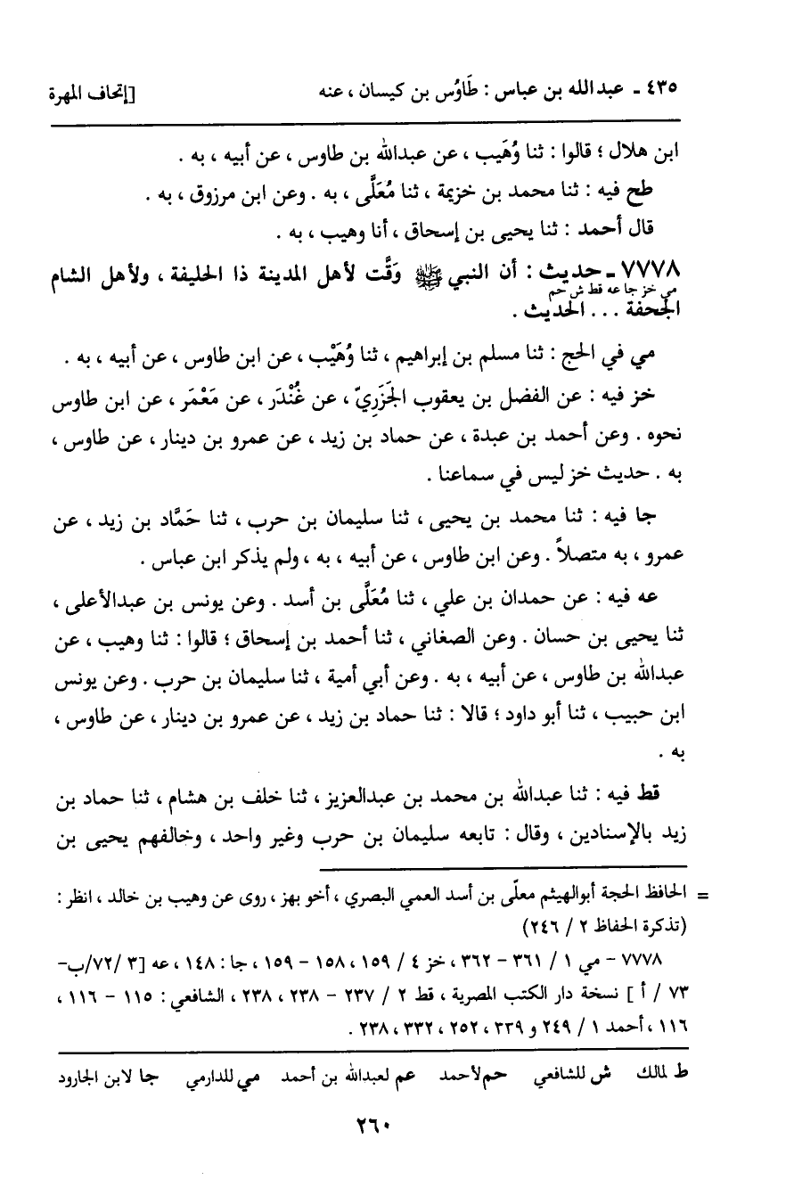 7778 - حَدِيثٌ (مي خز جا عه قط ش حم) : أَنَّ النَّبِيَّ صَلَّى اللَّهُ عَلَيْهِ وَسَلَّمَ، وَقَّتَ لأَهْلِ الْمَدِينَةِ ذَا الْحُلَيْفَةِ، وَلأَهْلِ الشَّامِ الْجُحْفَةِ ... الْحَدِيثَ. مي فِي الْحَجِّ: ثنا مُسْلِمُ بْنُ إِبْرَاهِيمَ، ثنا وُهَيْبٌ، عَنِ ابْنِ طَاوُسٍ، عَنْ أَبِيهِ، بِهِ. خز فِيهِ: عَنِ الْفَضْلِ بْنِ يَعْقُوبَ الْجَزَرِيِّ، عَنْ غُنْدَرٍ، عَنْ مَعْمَرٍ، عَنِ ابْنِ طَاوُسٍ نَحْوَهُ. وَعَنْ أَحْمَدَ بْنِ عَبْدَةَ، عَنْ حَمَّادِ بْنِ زَيْدٍ، عَنْ عَمْرِو بْنِ دِينَارٍ، عَنْ طَاوُسٍ، بِهِ. حَدِيثٌ خز لَيْسَ فِي سَمَاعِنَا. جا فِيهِ: ثنا مُحَمَّدُ بْنُ يَحْيَى، ثنا سُلَيْمَانُ بْنُ حَرْبٍ، ثنا حَمَّادُ بْنُ زَيْدٍ، عَنْ عَمْرٍو، بِهِ مُتَّصِلا. وَعَنِ ابْنِ طَاوُسٍ، عَنْ أَبِيهِ، بِهِ، وَلَمْ يَذْكُرِ ابْنَ عَبَّاسٍ. عه فِيهِ: عَنْ حَمْدَانَ بْنِ عَلِيٍّ، ثنا مُعَلَّى بْنُ أَسَدٍ. وَعَنْ يُونُسَ بْنِ عَبْدِ الأَعْلَى، ثنا يَحْيَى بْنُ حَسَّانٍ. وَعَنِ الصَّغَانِيِّ، ثنا أَحْمَدُ بْنُ إِسْحَاقَ؛ قَالُوا: ثنا وُهَيْبٌ، عَنْ عَبْدِ اللَّهِ بْنِ طَاوُسٍ، عَنْ أَبِيهِ، بِهِ. وَعَنْ أَبِي أُمَيَّةَ، ثنا سُلَيْمَانُ بْنُ حَرْبٍ. وَعَنْ يُونُسَ بْنِ حَبِيبٍ، ثنا أَبُو دَاوُدَ؛ قَالا: ثنا حَمَّادُ بْنُ زَيْدٍ، عَنْ عَمْرِو بْنِ دِينَارٍ، عَنْ طَاوُسٍ، بِهِ.