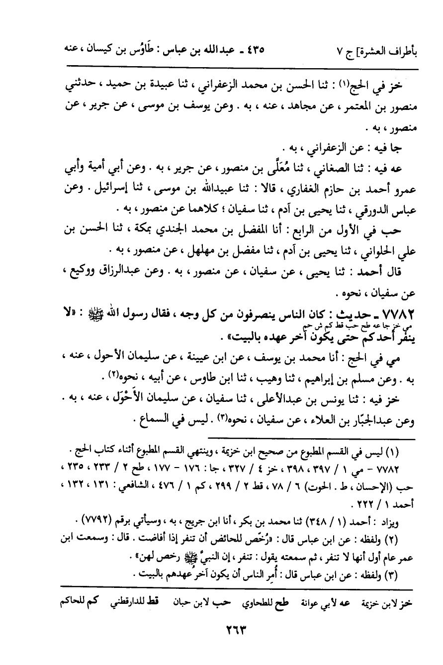 7782 - حَدِيثٌ (مي خز جا عه طح حب قط كم ش حم) : كَانَ النَّاسُ يَنْصَرِفُونَ مِنْ كُلِّ وَجْهٍ، فَقَالَ رَسُولُ اللَّهِ صَلَّى اللَّهُ عَلَيْهِ وَسَلَّمَ: " لا يَنْفِرْ أَحَدُكُمْ حَتَّى يَكُونَ آخِرُ عَهْدِهِ بِالْبَيْتِ ". مي فِي الْحَجِّ: أنا مُحَمَّدُ بْنُ يُوسُفَ، عَنِ ابْنِ عُيَيْنَةَ، عَنْ سُلَيْمَانَ الأَحْوَلِ، عَنْهُ، بِهِ. وَعَنْ مُسْلِمِ بْنِ إِبْرَاهِيمَ، ثنا وُهَيْبٌ، ثنا ابْنُ طَاوُسٍ، عَنْ أَبِيهِ، نَحْوَهُ. خز فِيهِ: ثنا يُونُسُ بْنُ عَبْدِ الأَعْلَى، ثنا سُفْيَانُ، عَنْ سُلَيْمَانَ الأَحْوَلِ، عَنْهُ، بِهِ. وَعَنْ عَبْدِ الْجَبَّارِ بْنِ الْعَلاءِ، عَنْ سُفْيَانَ، نَحْوَهُ. لَيْسَ فِي السَّمَاعِ.