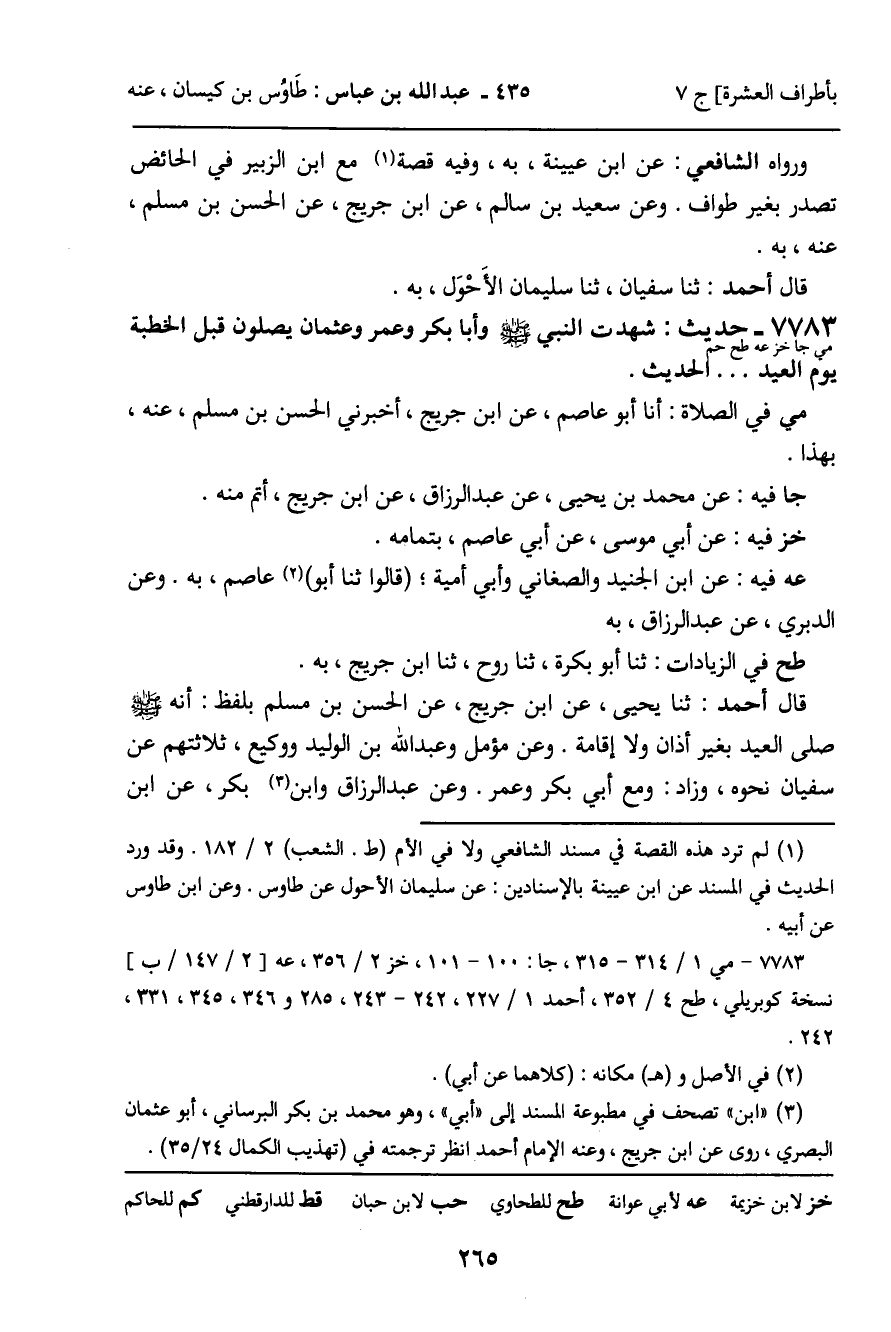 7783 - حَدِيثٌ (مي جا خز عه طح حم) : شَهِدْتُ النَّبِيَّ صَلَّى اللَّهُ عَلَيْهِ وَسَلَّمَ، وَأَبَا بَكْرٍ وَعُمَرَ وَعُثْمَانَ يُصَلُّونَ قَبْلَ الْخُطْبَةِ يَوْمَ الْعِيدِ ... الْحَدِيثَ. مي فِي الصَّلاةِ: أنا أَبُو عَاصِمٍ، عَنِ ابْنِ جُرَيْجٍ، أَخْبَرَنِي الْحَسَنُ بْنُ مُسْلِمٍ، عَنْهُ، بِهَذَا. جا فِيهِ: عَنْ مُحَمَّدِ بْنِ يَحْيَى، عَنْ عَبْدِ الرَّزَّاقِ، عَنِ ابْنِ جُرَيْجٍ، أَتَمَّ مِنْهُ. خز فِيهِ: عَنْ أَبِي مُوسَى، عَنْ أَبِي عَاصِمٍ، بِتَمَامِهِ. عه فِيهِ: عَنِ ابْنِ الْجُنَيْدِ وَالصَّغَانِيِّ وَأَبِي أُمَيَّةَ، قَالُوا: ثنا أَبُو عَاصِمٍ، بِهِ. وَعَنِ الدَّبَرِيِّ، عَنْ عَبْدِ الرَّزَّاقِ، بِهِ. طح فِي الزِّيَادَاتِ: ثنا أَبُو بَكْرَةَ، ثنا رَوْحٌ، ثنا ابْنُ جُرَيْجٍ، بِهِ. قَالَ أَحْمَدُ: ثنا يَحْيَى، عَنِ ابْنِ جُرَيْجٍ، عَنِ الْحَسَنِ بْنِ مُسْلِمٍ بِلَفْظِ: أَنَّهُ صَلَّى اللَّهُ عَلَيْهِ وَسَلَّمَ، صَلَّى الْعِيدَ بِغَيْرِ أَذَانٍ وَلا إِقَامَةٍ. وَعَنْ مُؤَمَّلٍ وَعَبْدِ اللَّهِ بْنِ الْوَلِيدِ وَوَكِيعٍ، ثَلاثَتُهُمْ عَنْ سُفْيَانَ نَحْوَهُ، وَزَادَ: وَمَعَ أَبِي بَكْرٍ وَعُمَرَ. وَعَنْ عَبْدِ الرَّزَّاقِ وَابْنِ بَكْرٍ، عَنِ ابْنِ