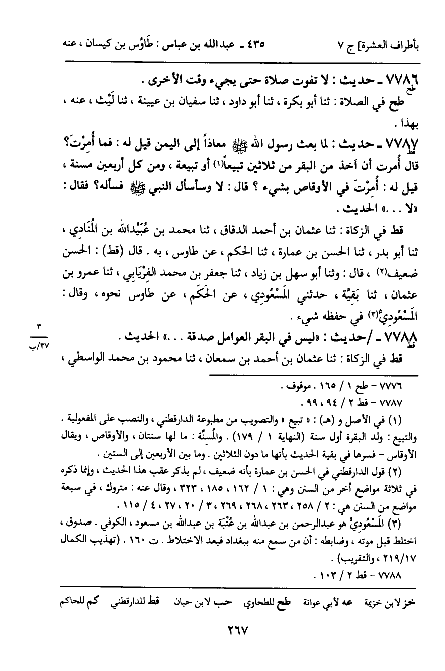 7787 - حَدِيثٌ (قط) : لَمَّا بَعَثَ رَسُولُ اللَّهِ صَلَّى اللَّهُ عَلَيْهِ وَسَلَّمَ، مُعَاذًا إِلَى الْيَمَنِ قِيلَ لَهُ: فَمَا أُمِرْتَ؟ قَالَ: أُمِرْتُ أَنْ آخُذَ مِنَ الْبَقَرِ مِنْ ثَلاثِينَ تَبِيعًا أَوْ تَبِيعَةً، وَمِنْ كُلِّ أَرْبَعِينَ مُسِنَّةً، قِيلَ: لَهُ: أُمِرْتَ فِي الأَوْقَاصِ بِشَيْءٍ؟ قَالَ: لا وَسَأَسْأَلُ النَّبِيَّ صَلَّى اللَّهُ عَلَيْهِ وَسَلَّمَ، فَسَأَلَهُ؟ فَقَالَ: " لا ... " الْحَدِيثَ. قط فِي الزَّكَاةِ: ثنا عُثْمَانُ بْنُ أَحْمَدَ الدَّقَّاقُ، ثنا مُحَمَّدُ بْنُ عُبَيْدِ اللَّهِ بْنِ الْمُنَادِي، ثنا أَبُو بَدْرٍ، ثنا الْحَسَنُ بْنُ عُمَارَةَ، ثنا الْحَكَمُ، عَنْ طَاوُسٍ، بِهِ. قَالَ قط: الْحَسَنُ ضَعِيفٌ، قَالَ: وثنا أَبُو سَهْلِ بْنُ زِيَادٍ، ثنا جَعْفَرُ بْنُ مُحَمَّدٍ الْفِرْيَابِيُّ، ثنا عَمْرُو بْنُ عُثْمَانَ، ثنا بَقِيَّةُ، حَدَّثَنِي الْمَسْعُودِيُّ، عَنِ الْحَكَمِ، عَنْ طَاوُسٍ نَحْوَهُ، وَقَالَ: الْمَسْعُودِيُّ فِي حِفْظِهِ شَيْءٌ.