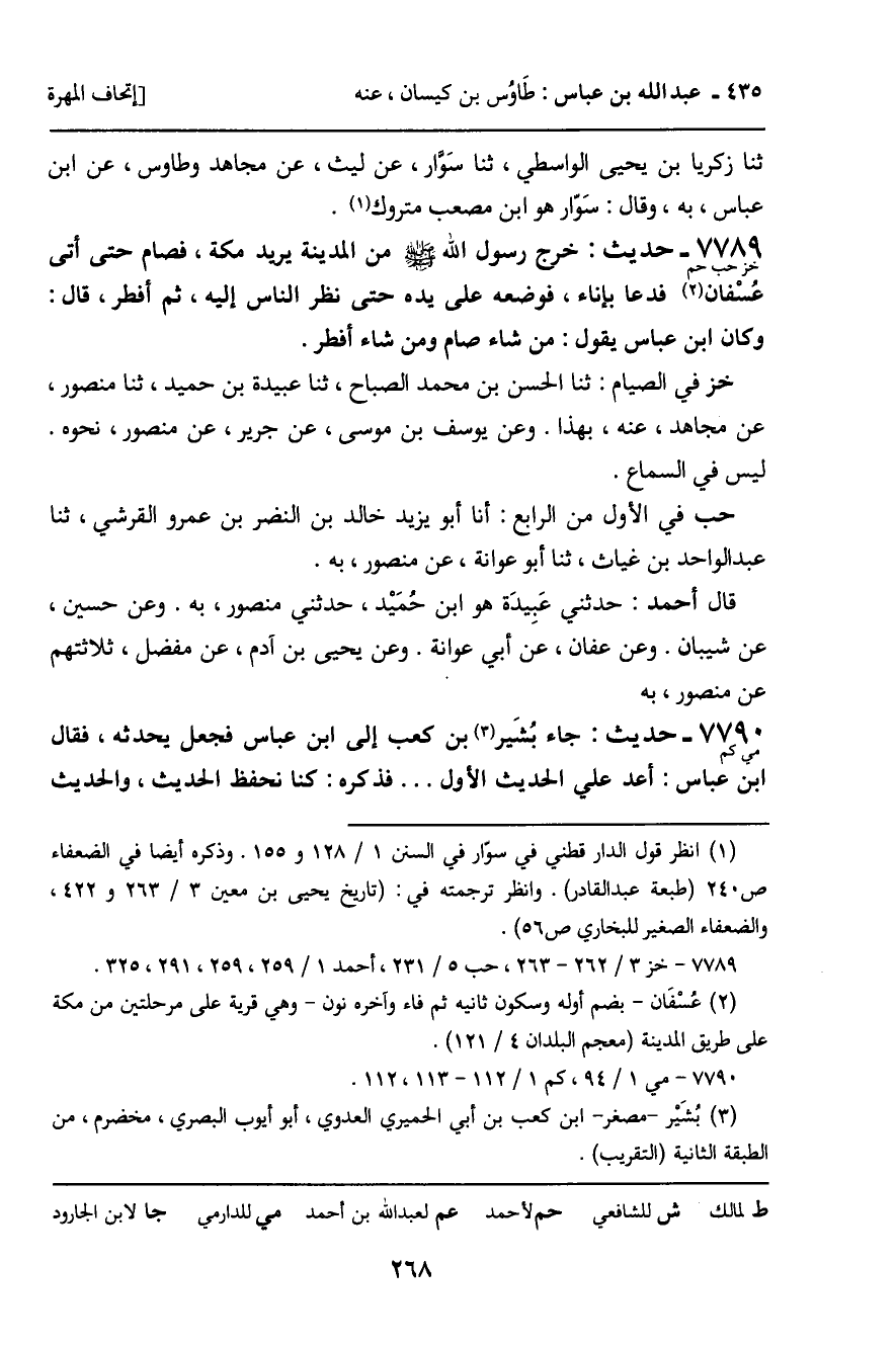 7789 - حَدِيثٌ (خز حب حم) : خَرَجَ رَسُولُ اللَّهِ مِنَ الْمَدِينَةِ يُرِيدُ مَكَّةَ، فَصَامَ حَتَّى أَتَى عُسْفَانَ فَدَعَا بِإِنَاءٍ فَوَضَعَهُ عَلَى يَدِهِ حَتَّى نَظَرَ النَّاسُ إِلَيْهِ، ثُمَّ أَفْطَرَ، قَالَ: وَكَانَ ابْنُ عَبَّاسٍ يَقُولُ: مَنْ شَاءَ صَامَ وَمَنْ شَاءَ أَفْطَرَ. خز فِي الصِّيَامِ: ثنا الْحَسَنُ بْنُ مُحَمَّدٍ الصَّبَّاحُ، ثنا عُبَيْدَةُ بْنُ حُمَيْدٍ، ثنا مَنْصُورٌ، عَنْ مُجَاهِدٍ، عَنْهُ، بِهَذَا. وَعَنْ يُوسُفَ بْنِ مُوسَى، عَنْ جَرِيرٍ، عَنْ مَنْصُورٍ، نَحْوَهُ، لَيْسَ فِي السَّمَاعِ. حب فِي الأَوَّلِ مِنَ الرَّابِعِ: أنا أَبُو يَزِيدَ خَالِدُ بْنُ النَّضْرِ بْنِ عَمْرٍو الْقُرَشِيُّ، ثنا عَبْدُ الْوَاحِدِ بْنُ غِيَاثٍ، ثنا أَبُو عَوَانَةَ، عَنْ مَنْصُورٍ، بِهِ. قَالَ أَحْمَدُ: حَدَّثَنِي عُبَيْدَةُ هُوَ ابْنُ حُمَيْدٍ، حَدَّثَنِي مَنْصُورٌ، بِهِ. وَعَنْ حُسَيْنٍ، عَنْ شَيْبَانَ. وَعَنْ عَفَّانَ، عَنْ أَبِي عَوَانَةَ. وَعَنْ يَحْيَى بْنِ آدَمَ، عَنْ مُفَضَّلٍ، ثَلاثَتُهُمْ عَنْ مَنْصُورٍ، بِهِ.