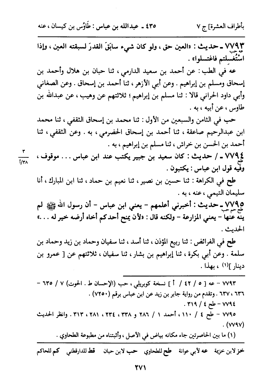 7793 - حَدِيثٌ (عه حب) : " الْعَيْنُ حَقٌّ، وَلَوْ كَانَ شَيْءٌ سَابِقَ الْقَدَرَ لَسَبَقَتْهُ الْعَيْنُ، وَإِذَا اسْتُغْسِلْتُمْ فَاغْتَسِلُوا ". عه فِي الطِّبِّ: عَنْ أَحْمَدَ بْنِ سَعِيدٍ الدَّارِمِيِّ، ثنا حِبَّانُ بْنُ هِلالٍ وَأَحْمَدُ بْنُ إِسْحَاقَ، وَمُسْلِمُ بْنُ إِبْرَاهِيمَ. وَعَنْ أَبِي الأَزْهَرِ، ثنا أَحْمَدُ بْنُ إِسْحَاقَ. وَعَنِ الصَّغَانِيِّ، وَأَبِي دَاوُدَ الْحَرَّانِيِّ قَالا: ثنا مُسْلِمُ بْنُ إِبْرَاهِيمَ؛ ثَلاثَتُهُمْ عَنْ وُهَيْبٍ، عَنْ عَبْدِ اللَّهِ بْنِ طَاوُسٍ، عَنْ أَبِيهِ، بِهِ. حب فِي الثَّامِنِ وَالسَّبْعِينَ مِنَ الأَوَّلِ: ثنا مُحَمَّدُ بْنُ إِسْحَاقَ الثَّقَفِيُّ، ثنا مُحَمَّدُ بْنُ عَبْدِ الرَّحِيمِ صَاعِقَةُ، ثنا أَحْمَدُ بْنُ إِسْحَاقَ الْحَضْرَمِيُّ، بِهِ. وَعَنِ الثَّقَفِيِّ، ثنا أَحْمَدُ بْنُ الْحَسَنِ بْنِ خِرَاشٍ، ثنا مُسْلِمُ بْنُ إِبْرَاهِيمَ، بِهِ.