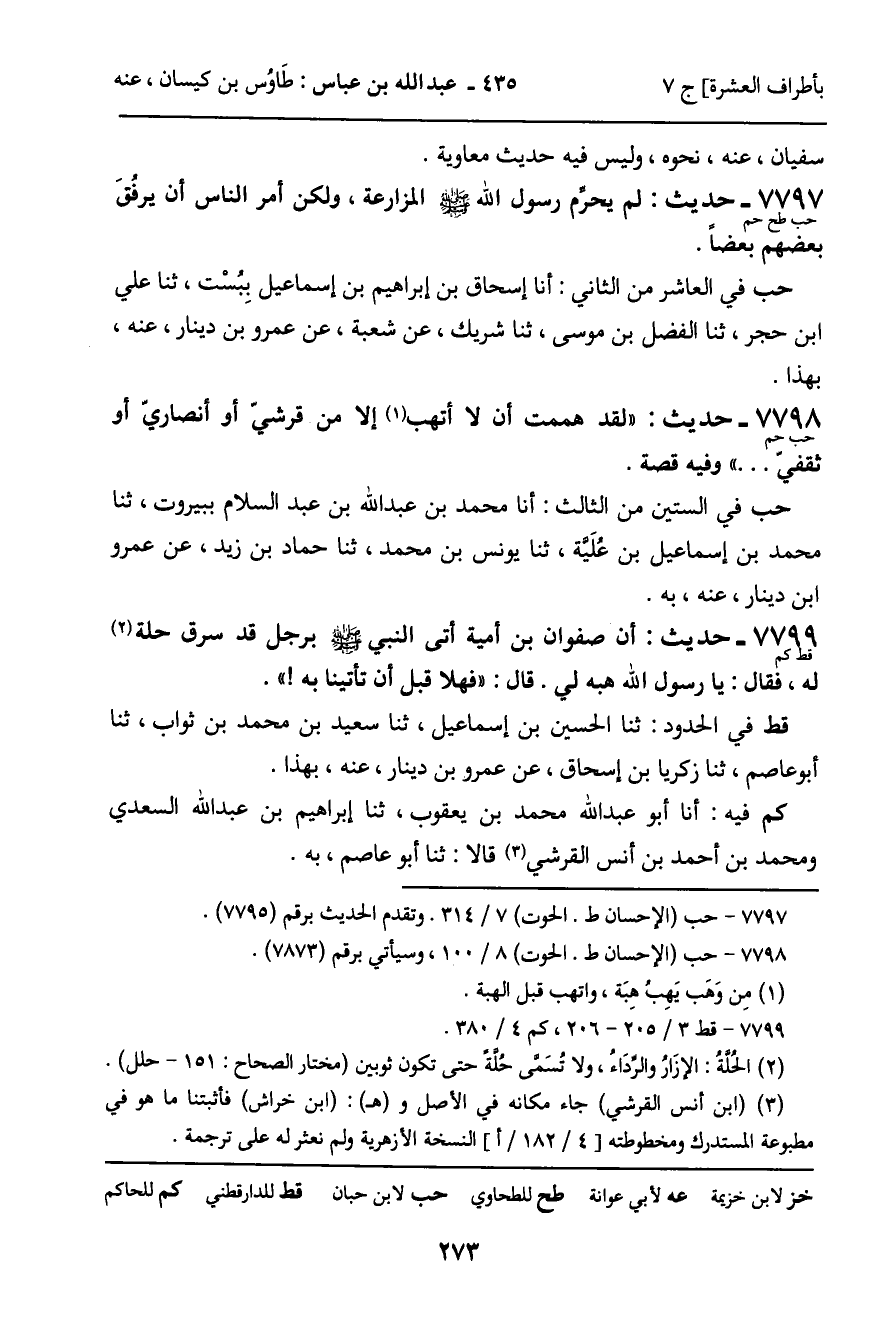7798 - حَدِيثٌ (حب حم) : " لَقَدْ هَمَمْتُ أَنْ لا أَتَّهِبَ إِلا مِنْ قُرَشِيٍّ أَوْ أَنْصَارِيٍّ أَوْ ثَقَفِيٍّ ... " وَفِيهِ قِصَّةٌ. حب فِي السِّتِّينَ مِنَ الثَّالِثِ: أنا مُحَمَّدُ بْنُ عَبْدِ اللَّهِ بْنِ عَبْدِ السَّلامِ بِبَيْرُوتَ، ثنا مُحَمَّدُ بْنُ إِسْمَاعِيلَ بْنِ عُلَيَّةَ، ثنا يُونُسُ بْنُ مُحَمَّدٍ، ثنا حَمَّادُ بْنُ زَيْدٍ، عَنْ عَمْرِو بْنِ دِينَارٍ، عَنْهُ، بِهِ.